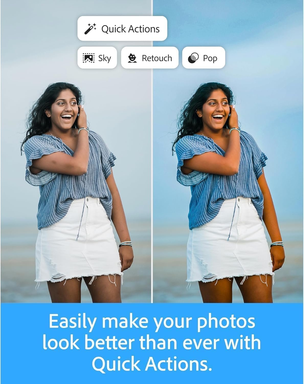 Make your photos look better than ever with powerful new features in Lightroom. Quick Actions instantly give you suggestions tailored to your photo so you can get the look you want. And with Generative Remove, it’s easy to clean up anything in a touch.