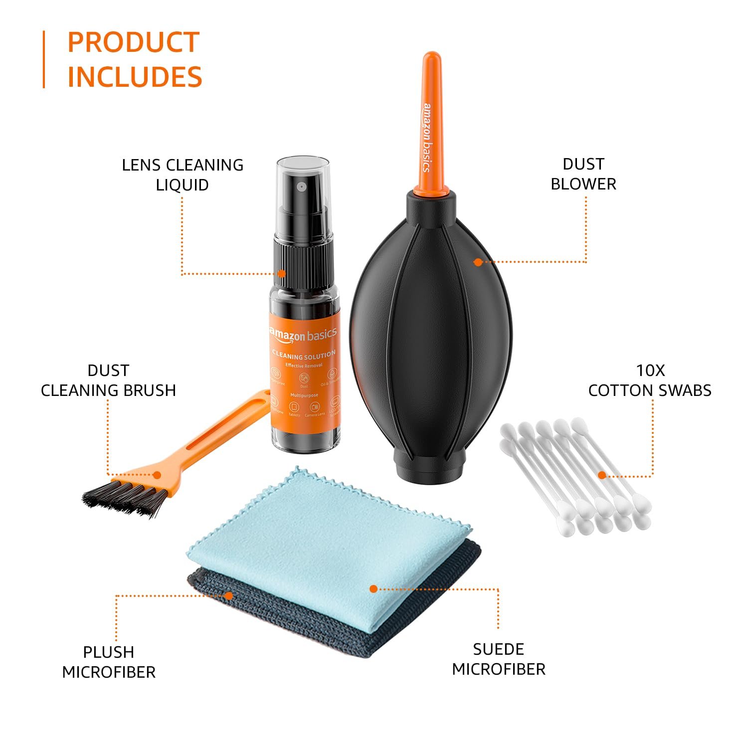 Introducing the Amazon Basics Professional 6-in-1 Cleaning Kit – your essential companion for maintaining pristine optics and electronics. Designed for digital cameras, DSLRs, laptops, tablets, and more, this kit includes a powerful dust air blower, 10 cotton swabs, plush Micro-Fiber Cloth, Suede microfiber cloth, dust removal antistatic cleaning brush, and 25 ml lens cleaning solution. Ensure your valuable equipment stays free of dirt, smudges, and fingerprints with this carefully curated cleaning kit. Each tool is inspected before shipping. Elevate your photography and device care routine with Amazon Basics.