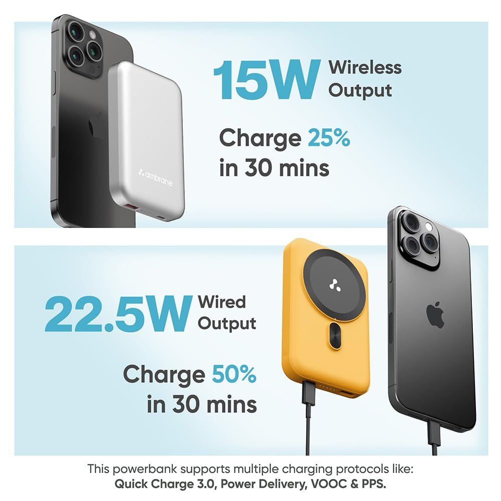 Multiple Charging Ports: Equipped with a 22W Type-C, 22.5W USB-A, and 15W MagSafe output, this power bank delivers fast and efficient charging for a variety of devices, ensuring you stay connected.