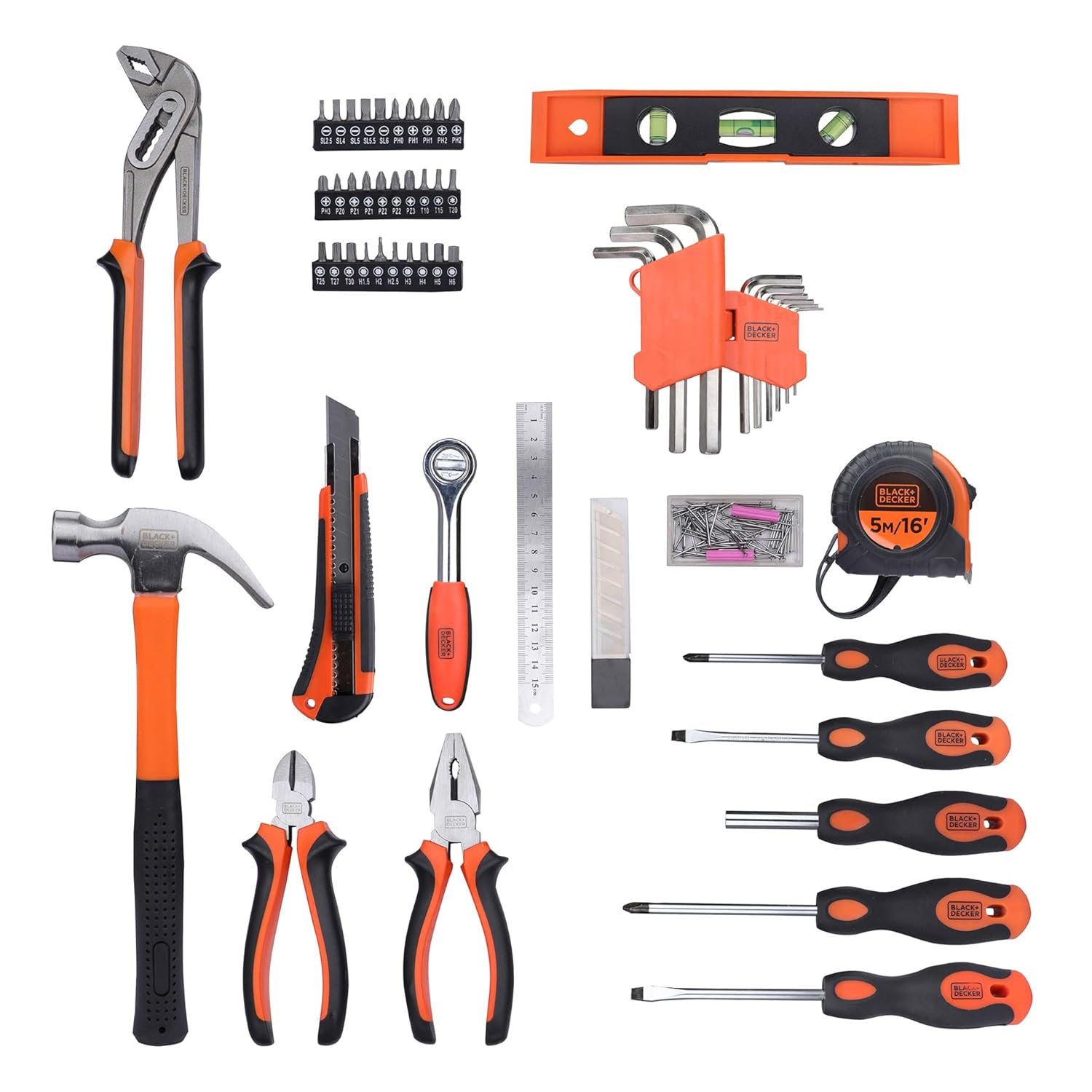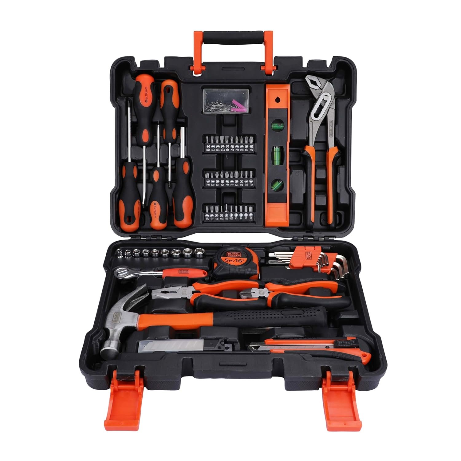 BLACK+DECKER BMT154C Hand Tool Kit for Home & DIY Use (154-Piece) – Includes Screwdriver, Wrench, Ratchet, Utility Knife, Saw, Claw Hammer, Measuring Tape and Plier, 6 Month Warranty, ORANGE & BLACK