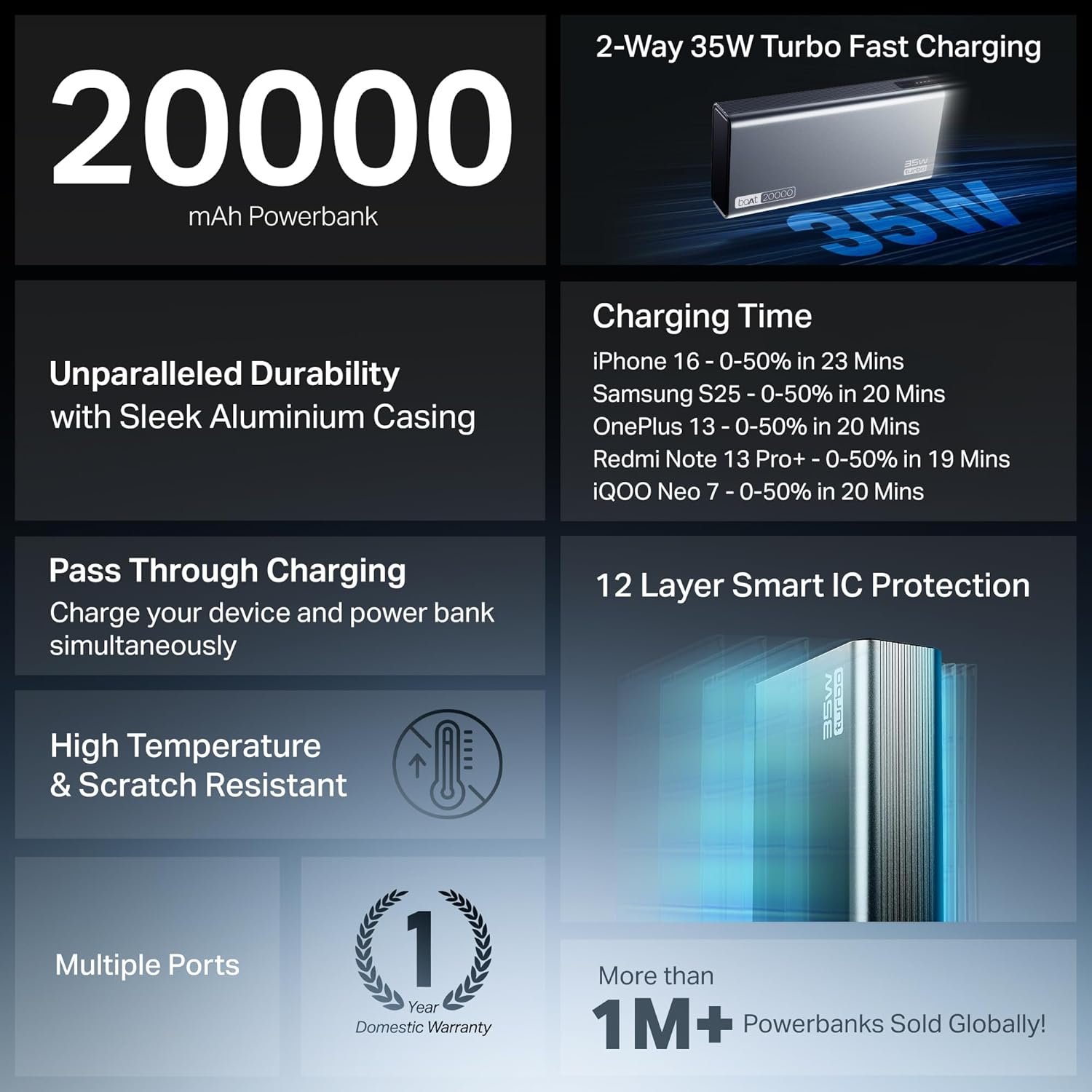 boAt Newly Launched PB435 Turbo 35W Power Bank with 20000mAh Battery, 35W 2-Way Super Fast Charging | 12-Layer Smart IC Protection | Triple Output & Dual Input in Sleek Aluminium Casing(Stone Grey)