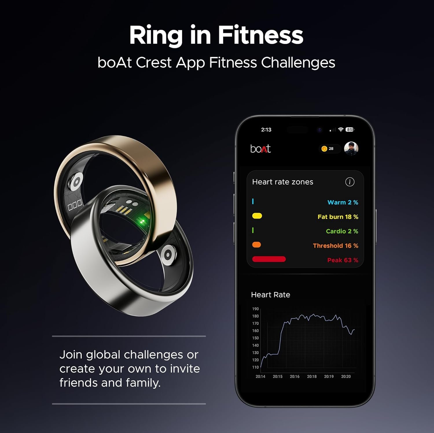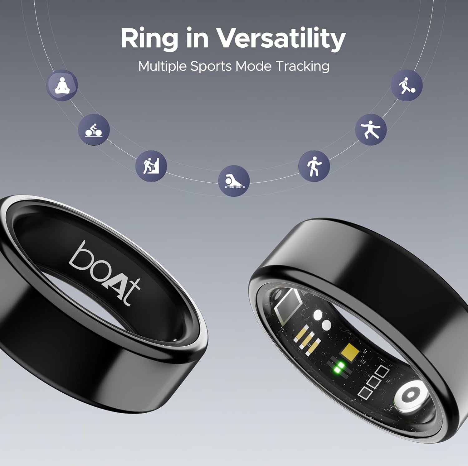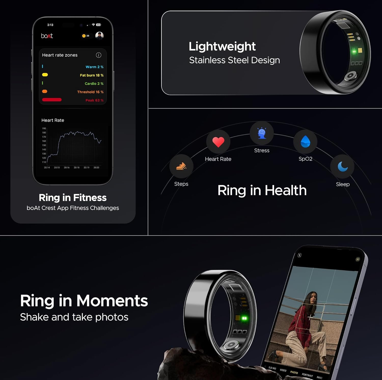 Boat SmartRing Active w/Stylish Stainless-Steel & Lightweight, Health Monitor, Magnetic Charging Case, 5ATM,Crest App & Coins, 20+ Sports Modes(Midnight Black 11)