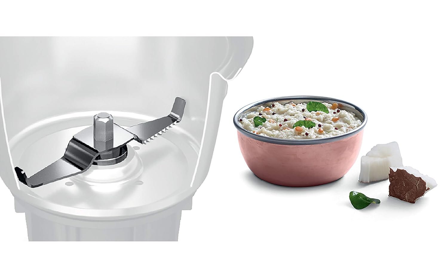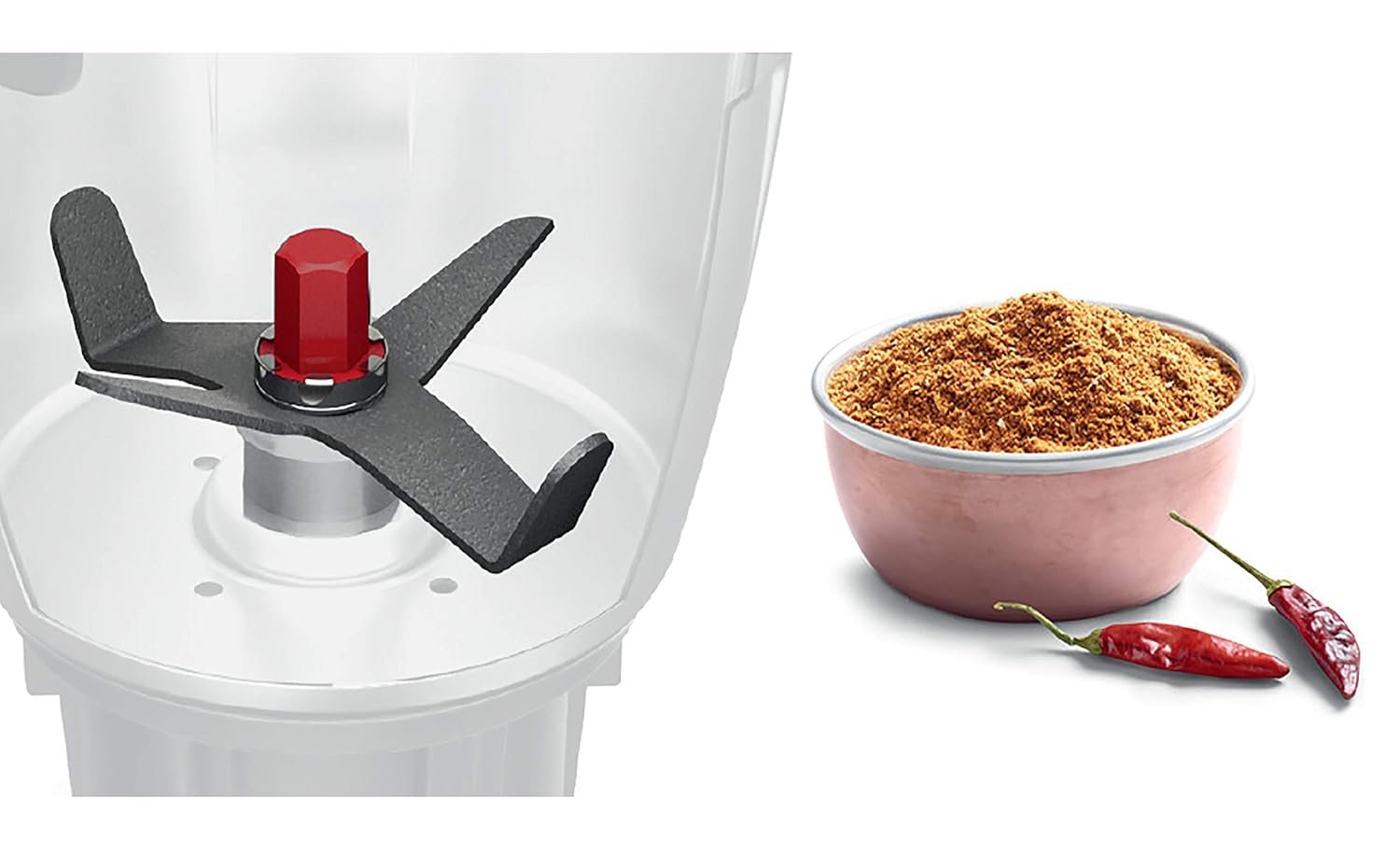 Uniquely designed blunt PoundingBlade with thick edges replicates a pounding effect on dry ingredients, thus giving authentic Sambhar Masala.