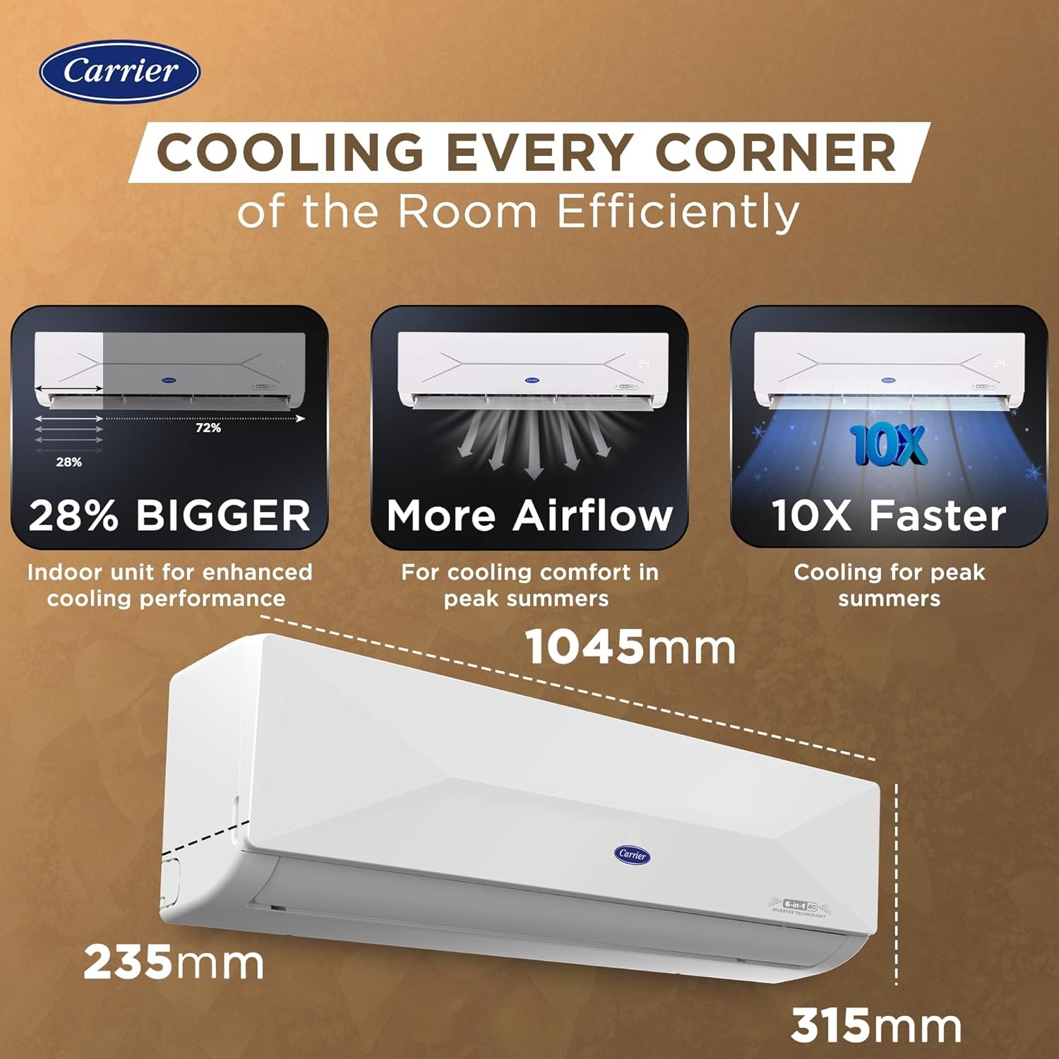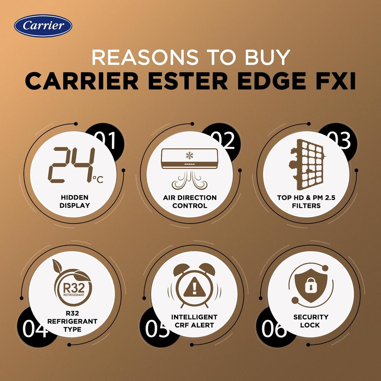 Elevate your comfort with the New 2025 Carrier Ester Edge Smart Air conditioners, a perfect companion for modern homes. Engineered to deliver exceptional performance, this AC blends innovative technology with user-friendly features, ensuring a seamless cooling experience tailored to your lifestyle. The standout Flexicool Inverter Technology offers six energy-efficient modes, allowing you to customize cooling based on your preferences while saving power. Additionally,it also provides versatility, adapting effortlessly to different weather conditions and room requirements. Breathing clean air is a breeze with its advanced dual filtration system, featuring a PM 2.5 filter and HD filtration, which effectively remove fine particles and impurities from your indoor air. For added convenience, the Auto Cleanser feature ensures the internal components stay free from dust and bacteria, enhancing both performance and durability. Designed for today’s smart lifestyle, the AC comes with Wi-Fi connectivity, letting you control it via a smartphone or voice assistant. The Smart Energy Display further empowers you to monitor and manage energy consumption effortlessly.Even in extreme temperatures as high as 52⁰C, this air conditioner delivers uninterrupted cooling, making it a reliable solution for scorching summers. With its sleek design and cutting-edge features, the Carrier Ester Edge FXi is your gateway to a healthier, cooler, and smarter home.