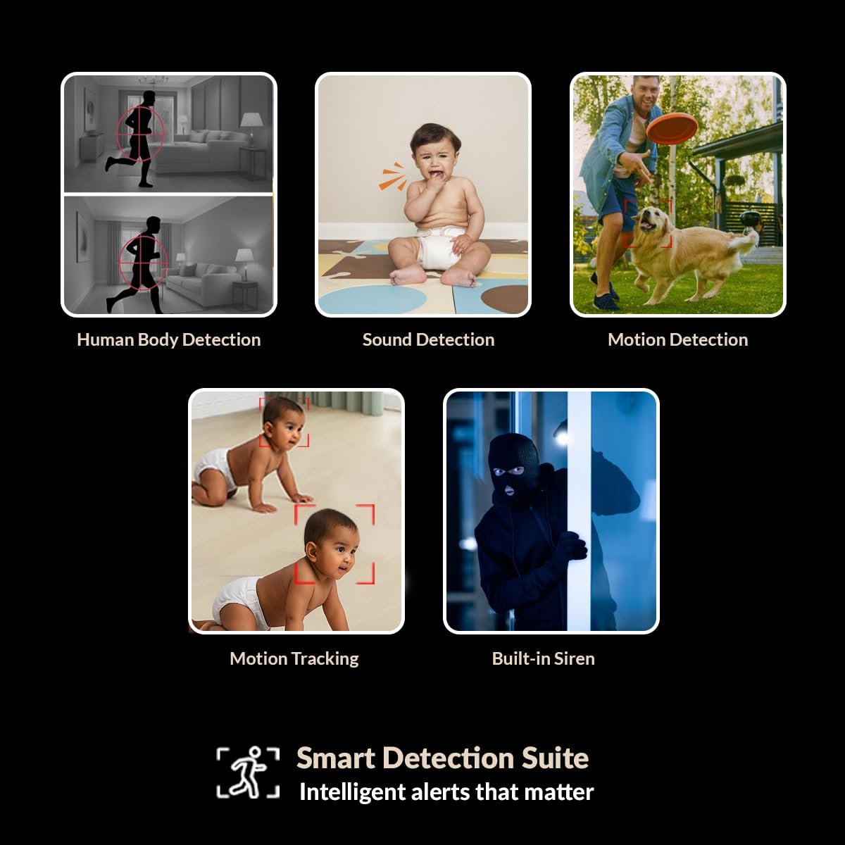 AI MOTION DETECTION & TRACKING: Equipped with AI-powered motion tracking, this Wi-Fi camera detects human movement and follows it automatically, sending real-time alerts through the ezyKam+ app to your smartphone.