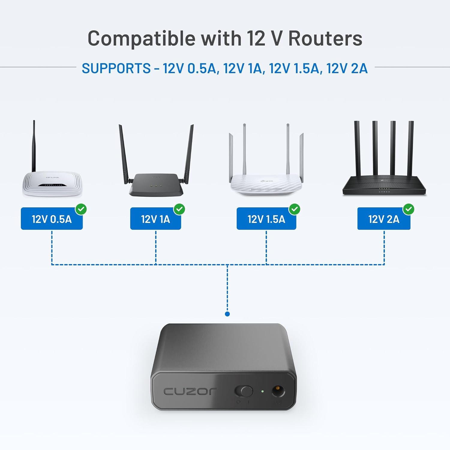 VERSATILE: Cuzor Mini UPS is compatible with all 12V WiFi routers. Supports 12V0.5A, 12V1A, 12V1.5A and 12V2A router power ratings