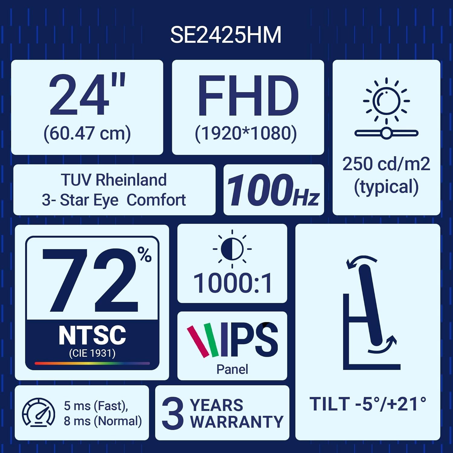 Dell SE2425HM 24″/60.96cm FHD Monitor, Ultra-Thin Bezels, 100Hz IPS Panel, 5 ms Response, Contrast 1000:1, Tilt Adjust, HDMI, VGA, Warranty 3 Years, Comfortview Plus, TÜV Rheinland 3-Star Eye Comfort