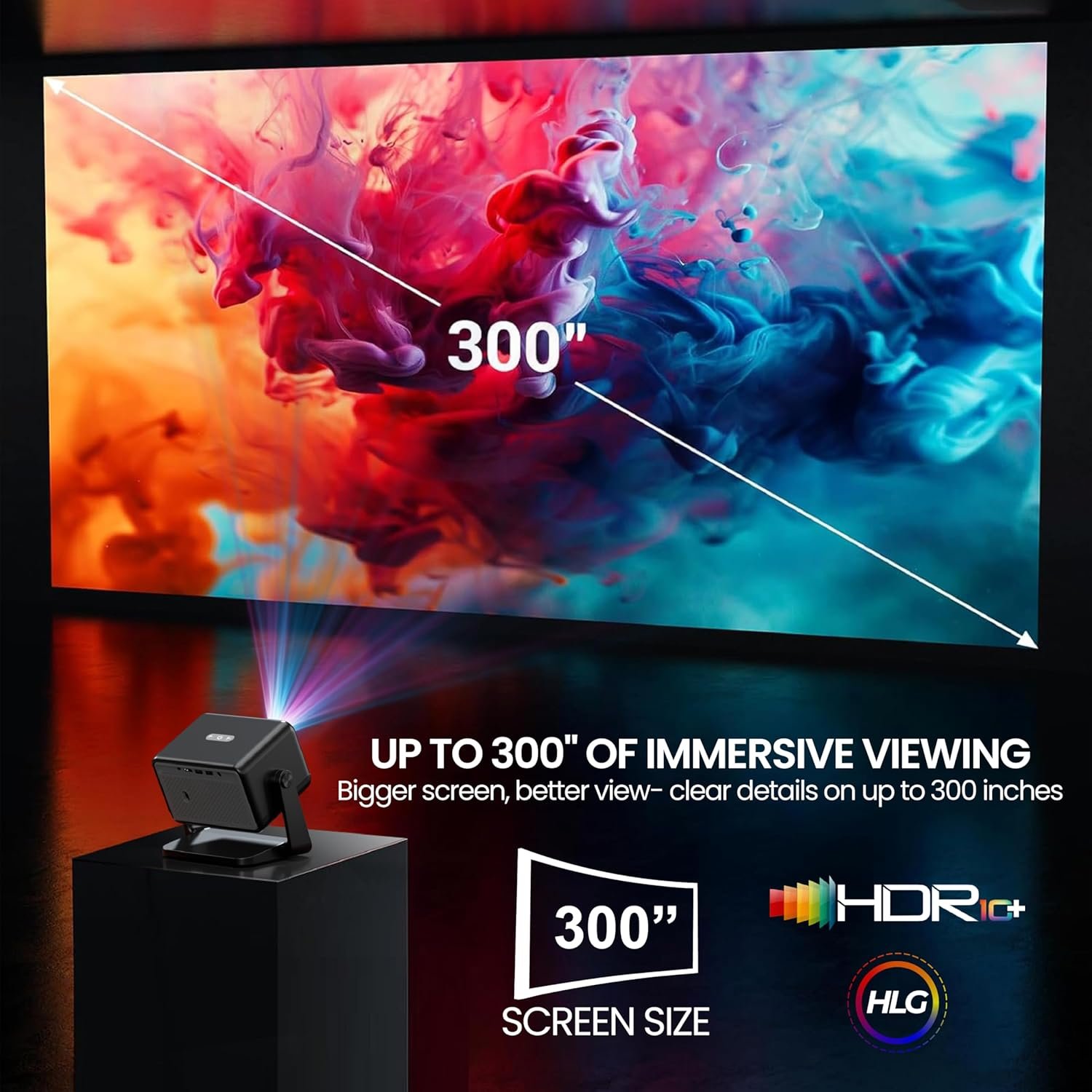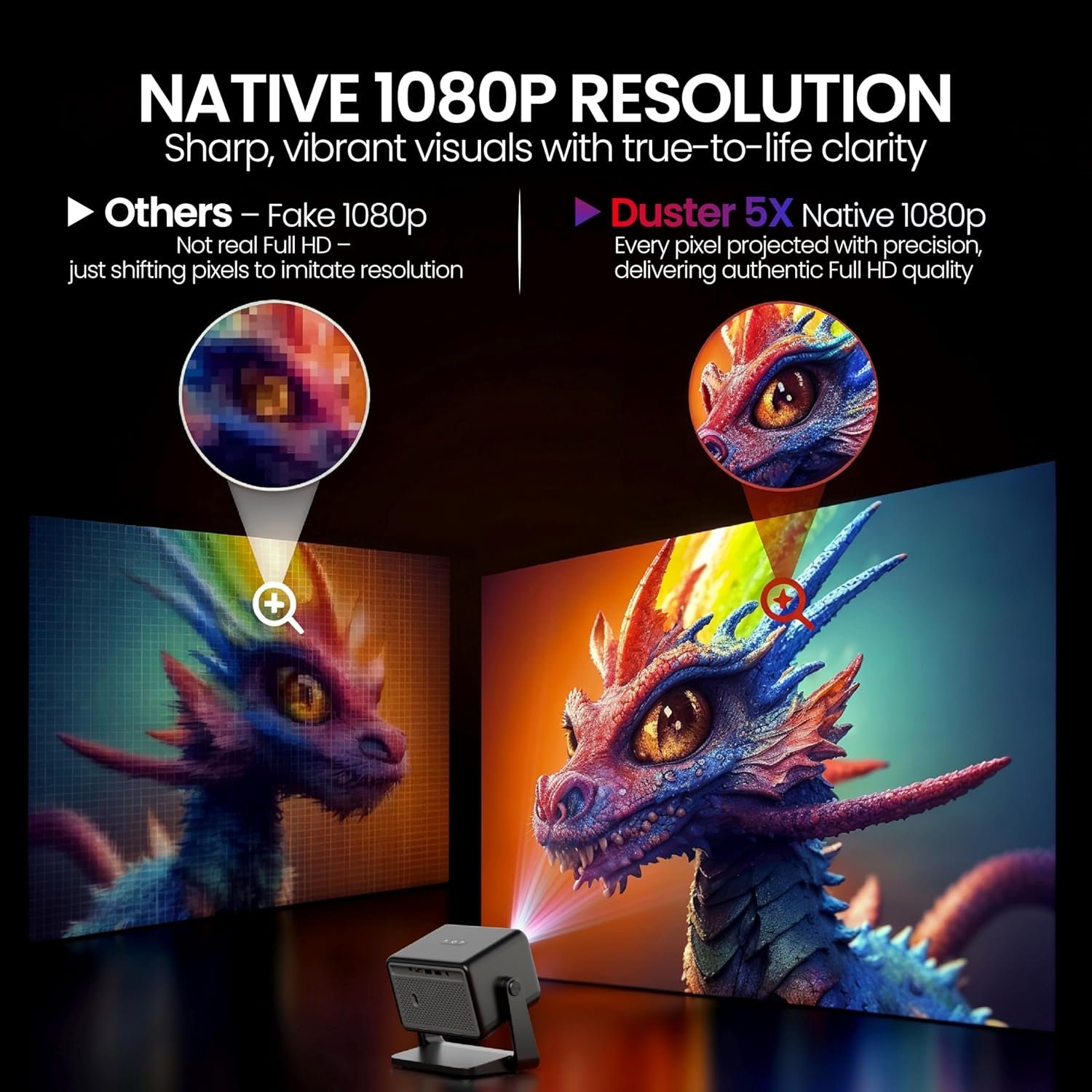 【Native 1080p | 5X Brighter | 4K HDR support | Fully Auomatic】 : Small is the new BIG, the Duster 5X Pro 2025 model in stunning mirror Black is a visual Marvel with 1080p Native , HDR + HLG and 5X brighter at 500 ISO Lumens equivalent or better than chinese brands claimed but unverifiable 14,000 lumens. The 6000 : 1 Contrast delivers a visual Feast on Massive 300″ (762cm)