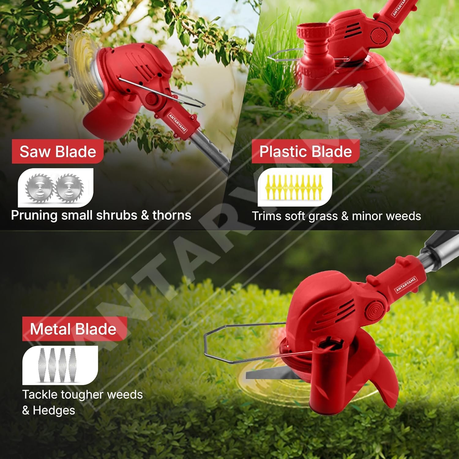Adjustable Height and Blades: Utilise configurable height settings to tailor your lawn-care experience to different surroundings. Different cutting requirements are met by the three types of blades that are included: plastic, stainless steel, and manganese steel. This tool can handle any surface, including soft grass, dense bush branches, and anything in between.