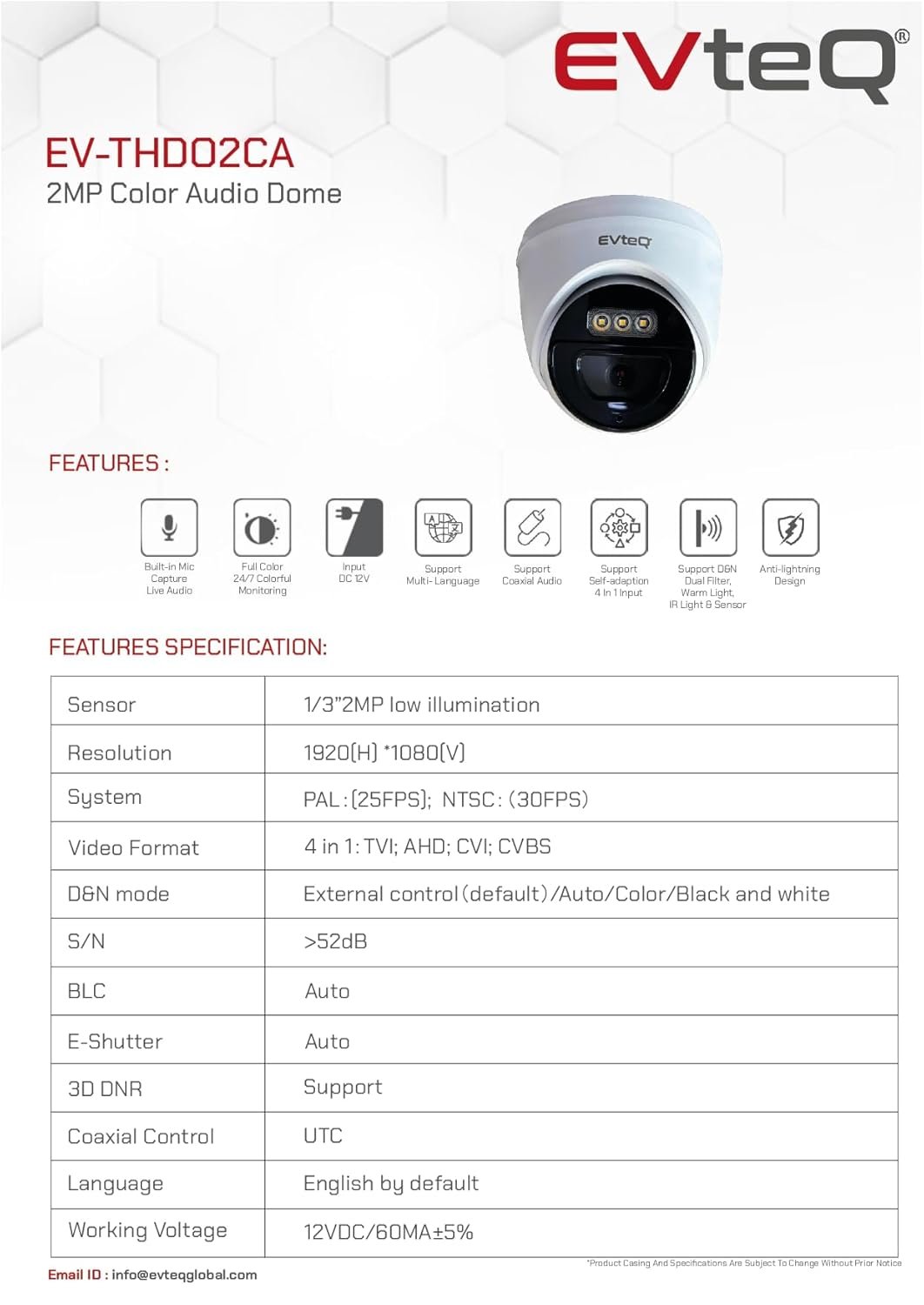 EVteQ 2MP Color Audio Dome Camera Designed for Both Indoor and Outdoor Surveillance Camera EV-THDO2CA