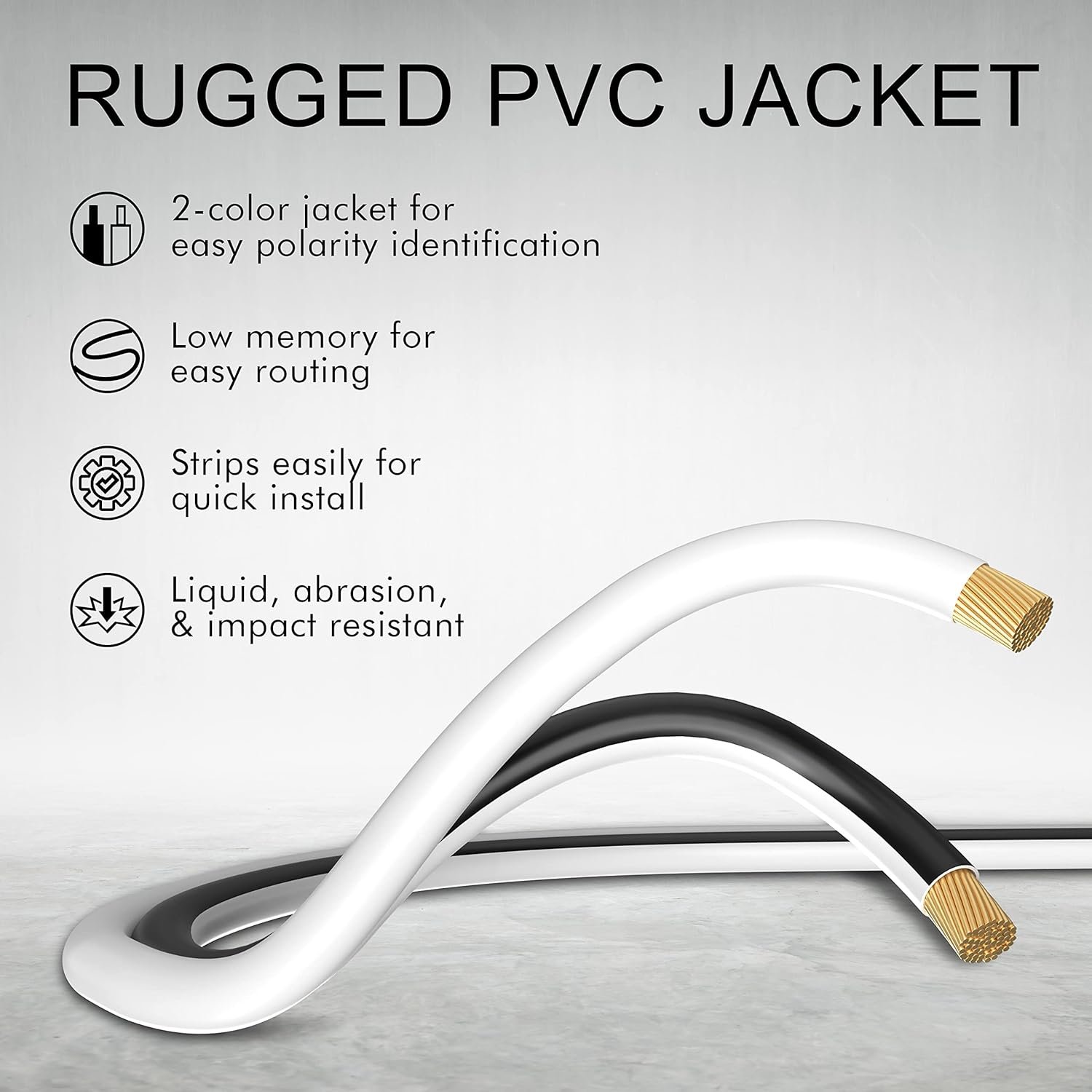 Low Memory Jacket Makes it Easy to Route Close to Wall MoldingsEasily Installs into Most Banana PlugsJacket Strips Easily for a Quick InstallRugged PVC Jacket Makes it Easy to Route through Car PanelsEasily Installs into Most Crimp Terminals