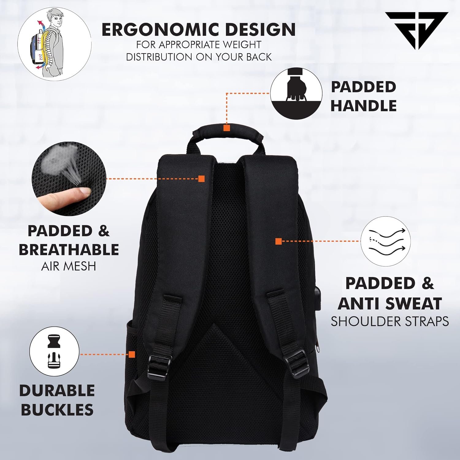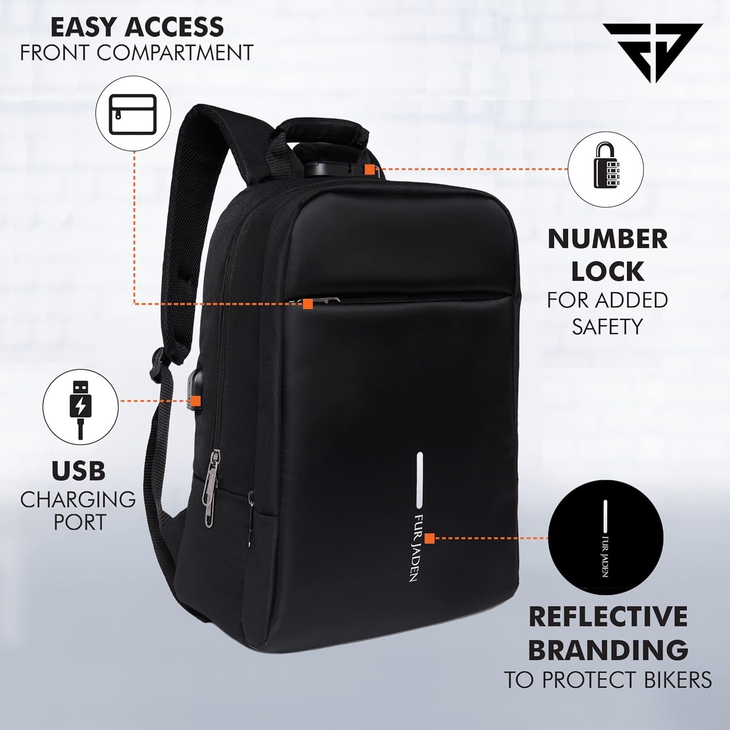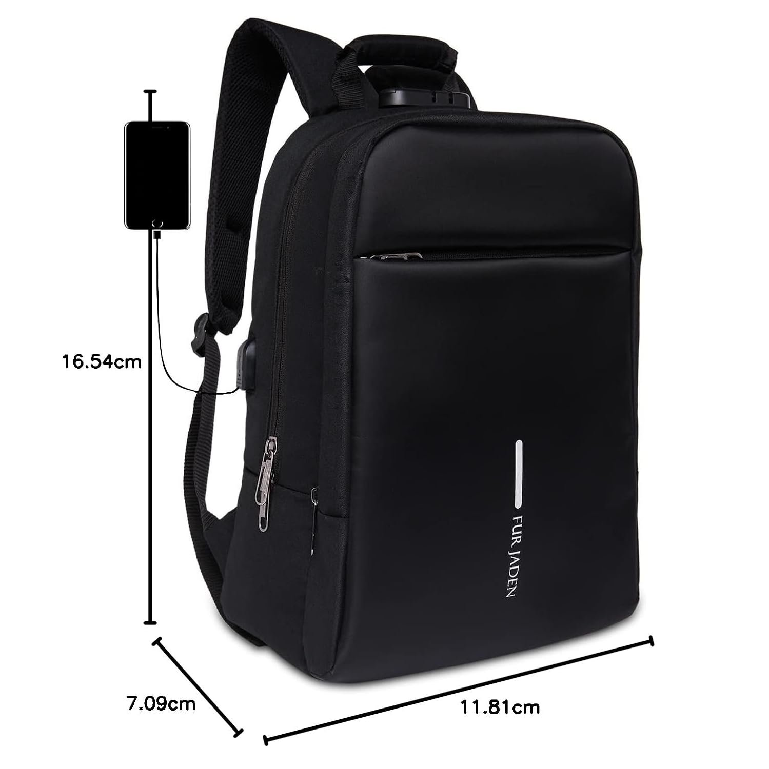Stay organized all day with a durable and lightweight backpack from Fur Jaden. This back pack is a stylish and functional accessory for men and women. Can add admiration to an appealing and daring personality with a remarkable aesthetics and functionality. This backpack features an anti-theft design. You can also charge your phone on the go and organize your stuff like pro. Fur Jaden functional back pack is apt to protect your gadgets and belongings from being stolen while you travel, thanks to its special anti-theft design. Now keep your belongings safe with style. The backpack features multiple compartments that you may use for your laptop and other essentials. A remarkable feature of this backpack allows you to charge your phone while you are on the move. With an attached charging dock in the back you may connect a portable power bank with ease. Weighing about 600grams, this backpack is lightweight. The backpack is able to house a laptop of up to 15.6 inches and has seven inner compartments to place your other essentials. Made from durable quality polymer this Fur Jaden back pack is sturdy and reliable. Flaunt this bag with style and low maintenance as this bag is washable. This backpack is also suitable for school or college. The straps are designed to distribute the weight equally on each shoulder preventing any sort of discomfort. Use this back pack for office, college/school or during travels.