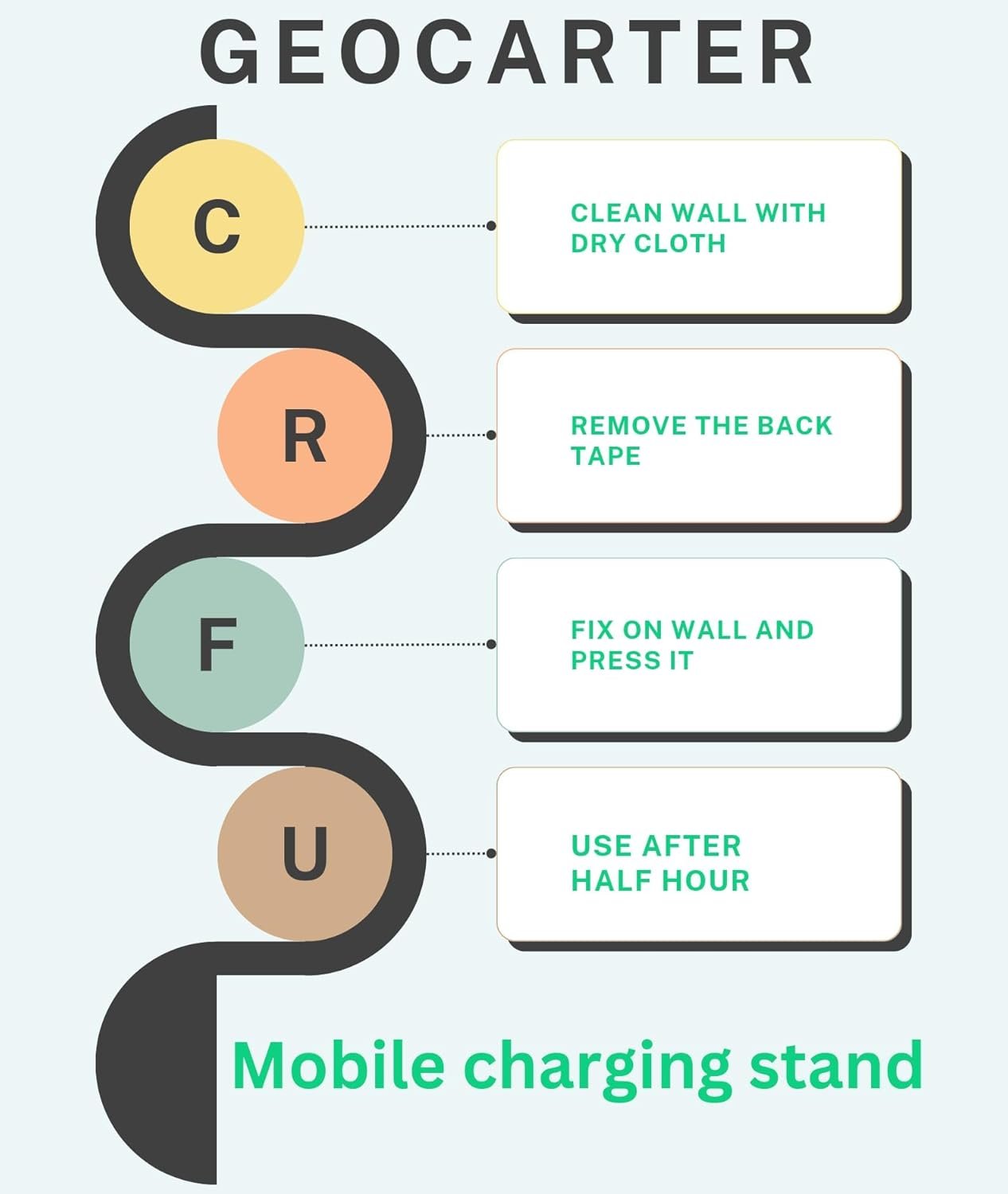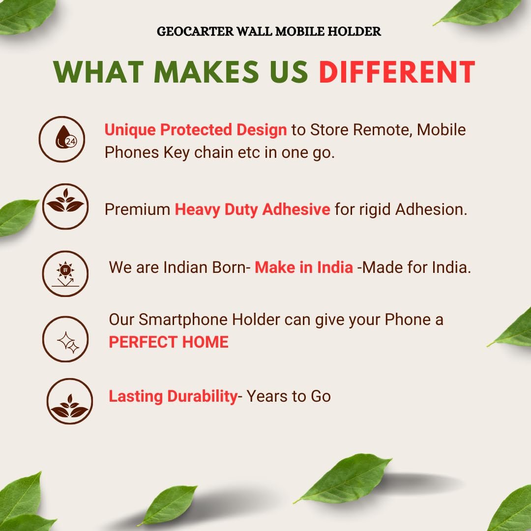 Wall Phone Holder Stand or Mount While Charging -Geocarter wall mount phone holder provides your phone a perfect place while charging. It has enough compartment space and storage to avoid your phone falling off and tangled mess. It is the perfect storage solution for all types of phones ranging from normal phone to smartphones while charging also can simultaneously used as remote stand. A fully Multifunctional HolderHow to Use This wall phone holder is designed to be attached to the wall. It comes with Heavy duty Adhesive tapes on back side just ensure the wall is dry and smooth then just stick it and press it properly. After stick this and wait for some time before using to make sure it sticks firmly.Usage- Easily place able on Office walls, HOME wall bedside wall, Restaurants, Bathrooms any place required and keep out of reach of children.Phone and remote It works for all sort of Phones ranging from normal keypad phones to smartphone, can be used to keep all size remote.lsoFeatures -It has Easy installation -Not harmful to electronics -Convenience to put the devices when charging -your device.AC/TV remote It has features to keep AC/TV remotes, can be used as Pen Pencil Holder and Key chain Hangers., can be used as Pen Pencil Holder and Key chain Hangers.AC/TV remote, , can be used as Pen Pencil Holder and Key chain Hangers.Package included: 1*Wall-Mounted Phone Charging stand, Instruction SheetNotes: 1. The Plugs, cables, switch, and devices shown on images just for show NOT INCLUDED.Intended only for use on smooth, non-textured surfaces.MADE IN INDIA