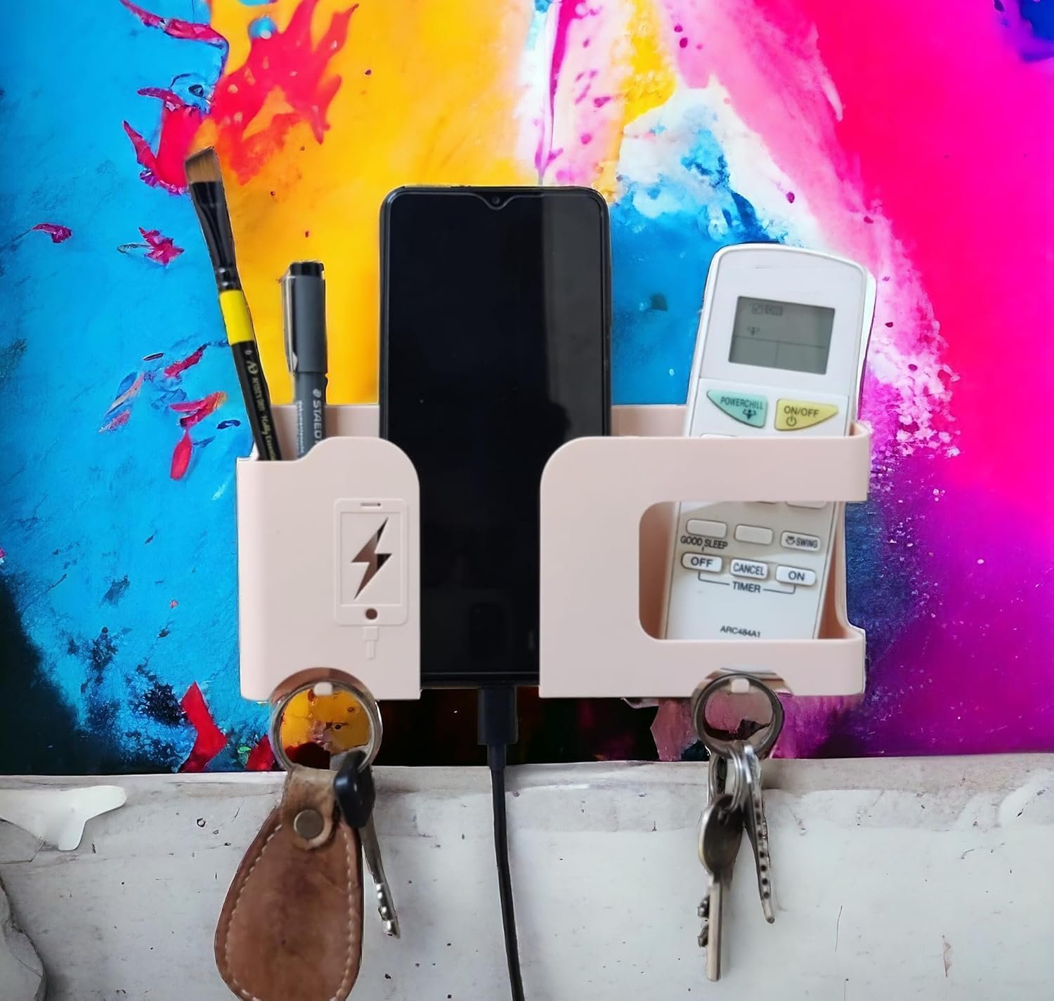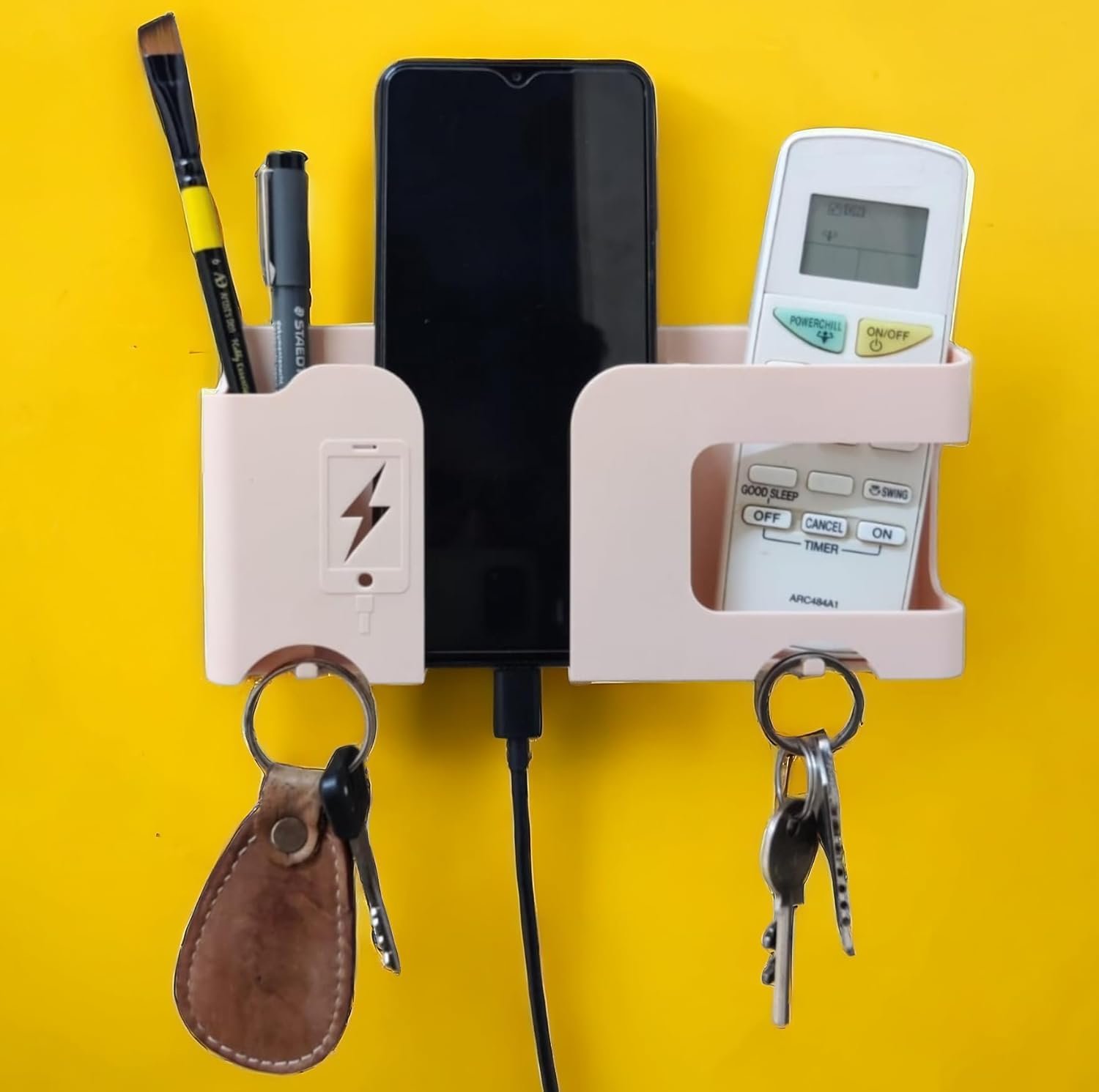 Wall Mobile Holder & Charging Space – Safely store and charge your phone. Remote Stand – Keep remotes organized and always within reach. Key Holder Hooks – Never misplace your keys again.Pen / Accessory Slot – Handy storage for pens or small tools. Multipurpose Use – Works in bedroom, kitchen, entryway, office, and more.