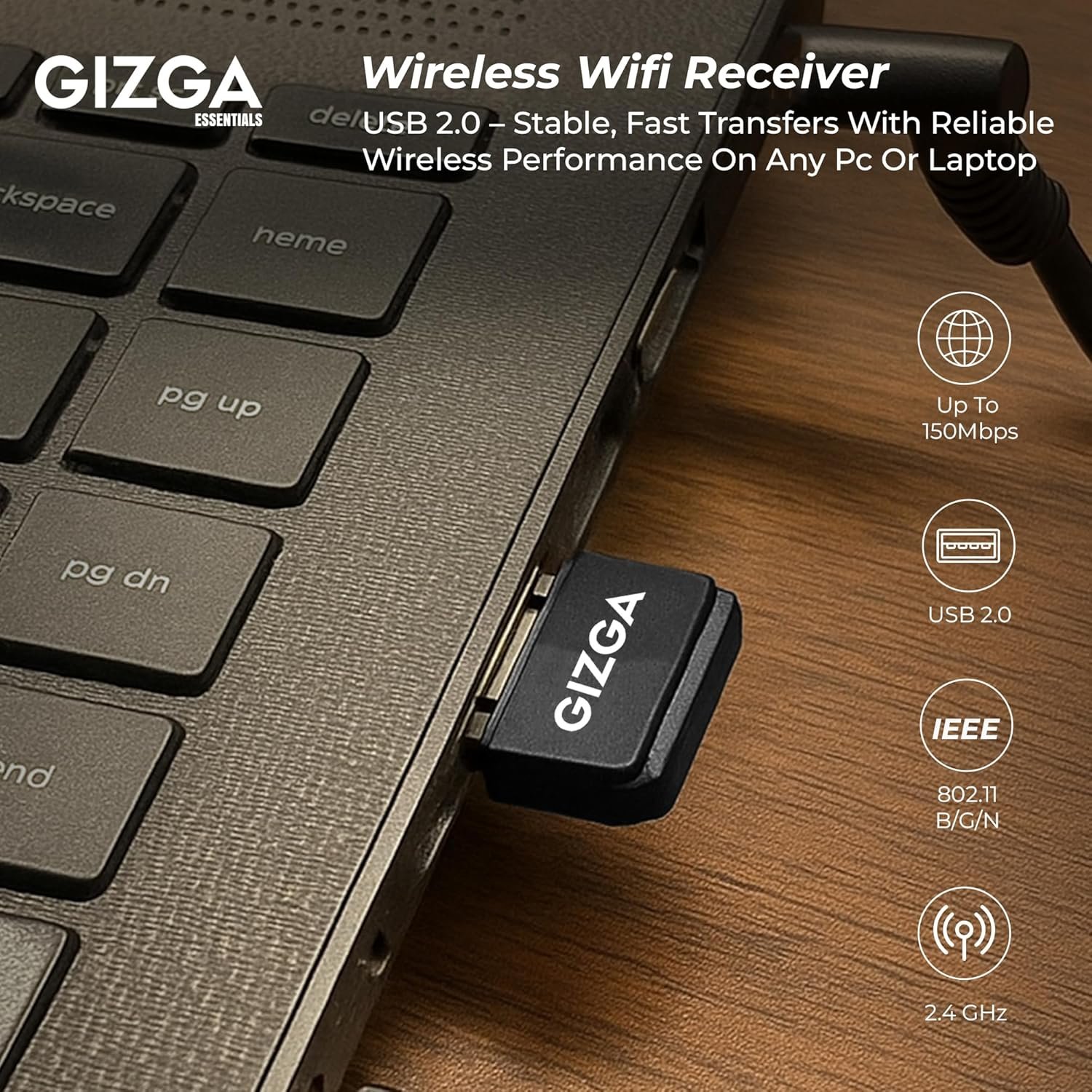 Gizga Essentials USB WiFi Receiver for PC | 150 Mbps Nano Size Wireless Network Dongle for Laptop| USB 2.0 High-Speed Interface, WPA/WPA2 Secure, Compatible with Windows/Mac/Linux Kernel (Black)