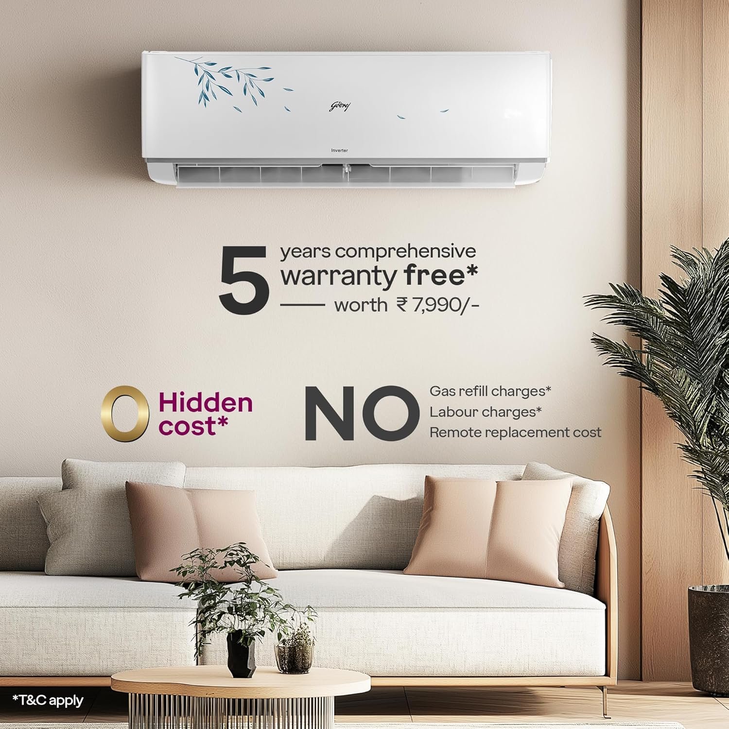 Manufacturer Warranty: 5 years free comprehensive, applicable on purchase after 1st Sept 2024 (Coverage: Labor and all functional parts: compressor, Inverter controller drive, Remote, Indoor PCB, Fan Motors, Heat Exchange coils and Gas Charging), 5 years on PCB, 10 years on compressor
