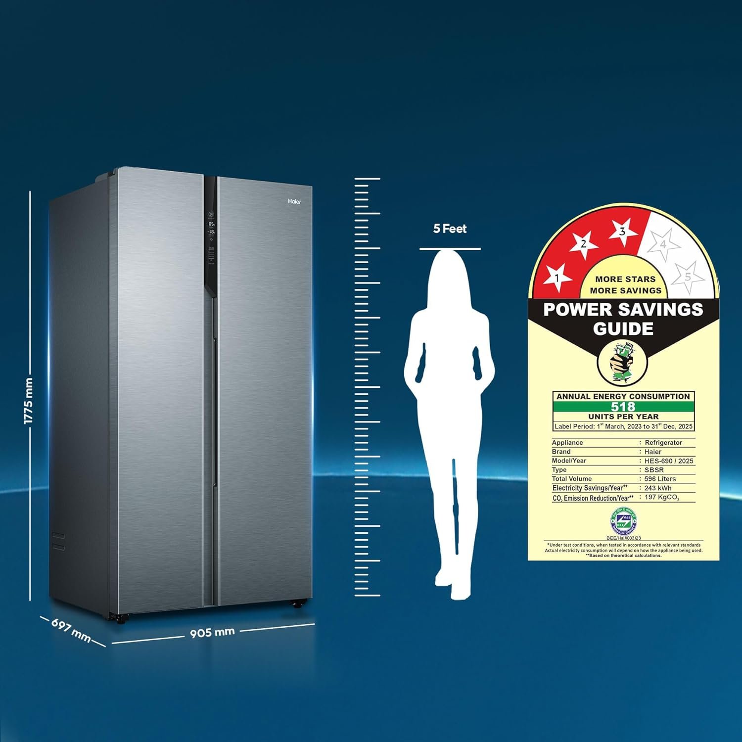 Haier 596L 3Star 2 Door Side by Side Frost Free Refrigerator|100% Convertible|Expert Inverter|Digital Display Panel|Twist Ice Tray|Deo Fresh Technology (HES-690SS, Shiny Silver)