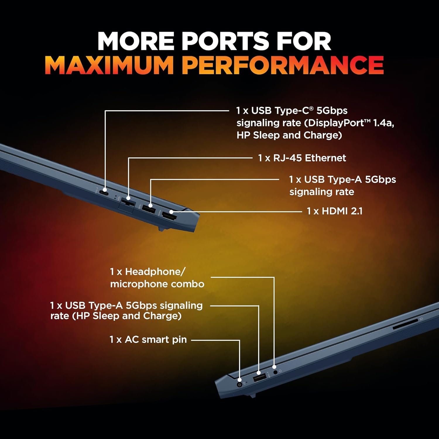 Ports & Connectivity : 1 USB Type-A 5Gbps signaling rate (HP Sleep and Charge); 1 USB Type-A 5Gbps signaling rate; 1 AC smart pin; 1 HDMI-out 2.1; 1 headphone/microphone combo; 1 RJ-45; 1 USB Type-C 5Gbps signaling rate (USB Power Delivery 3.1, DisplayPort 1.4a, HP Sleep and Charge)|