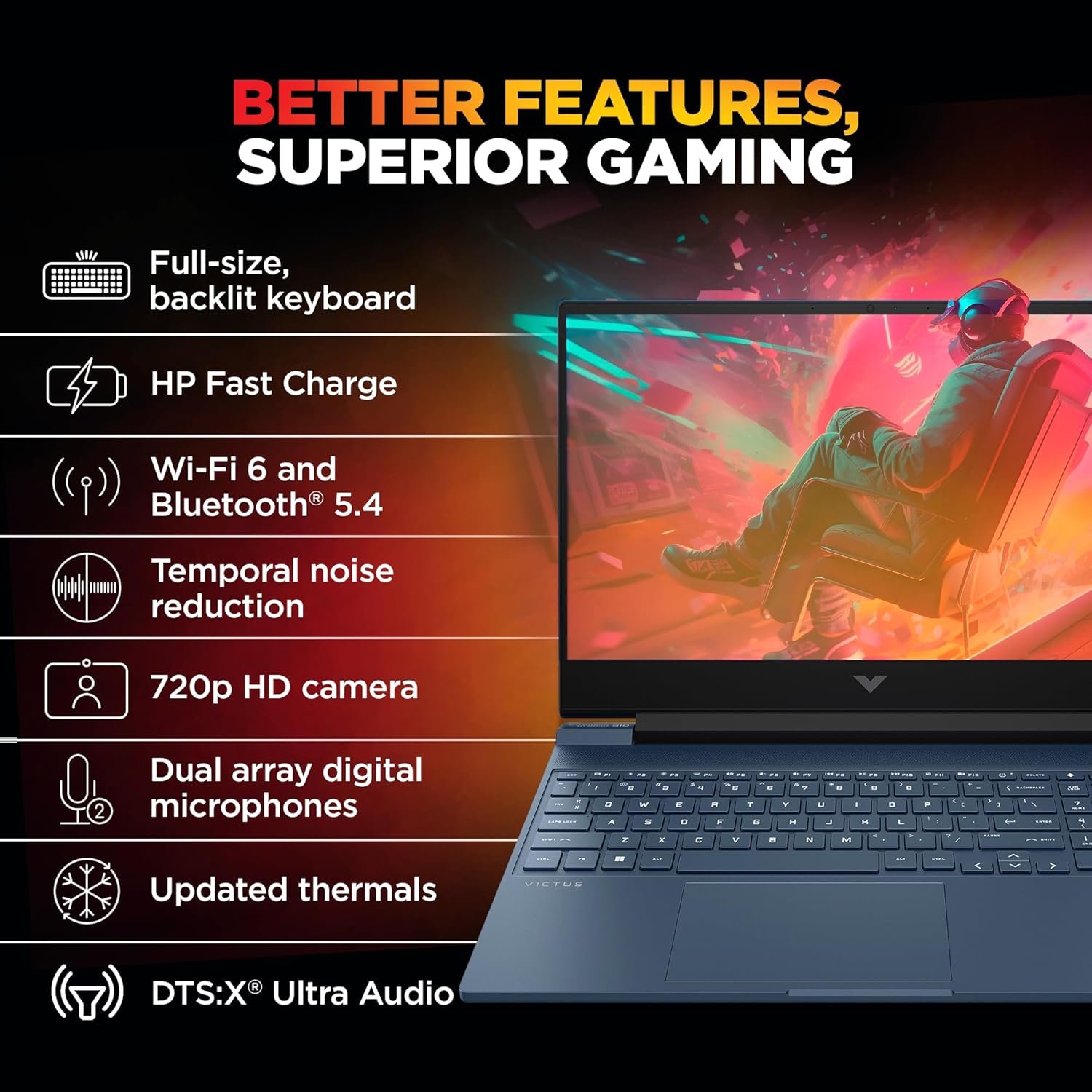 Other Features: Camera: HP Wide Vision 720p HD camera with temporal noise reduction and integrated dual array digital microphones| Keyboard: Full-size, backlit, performance blue opaque keyboard with numeric keypad| Audio:DTS:X Ultra;Dual speakers;HP Audio Boost |Battery type:3-cell, 52.5 Wh Li-ion polymer; Supports battery fast charge: approximately 50% in 45 minutes