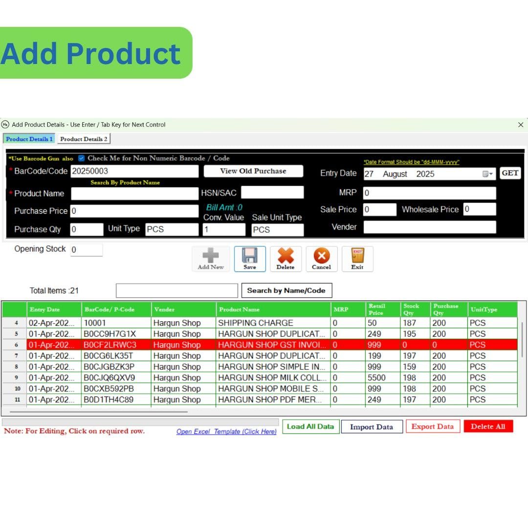 This Software Create in very Simple way that can Normal User Easily Run this Software. This will be suitable for Every Small Business . This Software save your lot of time. Its Design in Very Simple Method Every Normal User User this Software on First Day without any training . You can Import Product Data Through Excel File. View Old Purchase History of Products. You Can Easily Edit/Delete.Previous or Next Invoice. We can also set UPI for Invoice Amount QR Code. This Software also help to create barcode of your product. if you want customize this software according to your requirement than we can update this software according to your requirement. Othere Software Features 1.LIFETIME LICENSE 2.OFFLINE SOFTWARE 3.Top Selling Product 4.Generate Barcode 5.Purchase Management 6.Inventory management 7.Low Stock Alert 8.POS Enabled Invoicing 9.Use Barcode Scanner for Fast Billing 10.Direct Billing 11.Invoice Amount QR Code on Invoice 12. 50+ Invoice Template (A4/A5/80mm/58mm/102mm) 13.Sale Report 14. Purchase Report 15. Stock Report , DayBook Report 16. Basic Accounting 17. Customer Ledger , Vender Ledger 18. No Need to Installation 19. Free WhatsApp Message 20. Customer Reciept Voucher 21. Vender Payment Voucher 22. Voucher Report 23. Software Menu Rights Assign to Particular User 24. Credit and Debit Note 25. Customization available for Invoice and Barcode and Other Requirement.