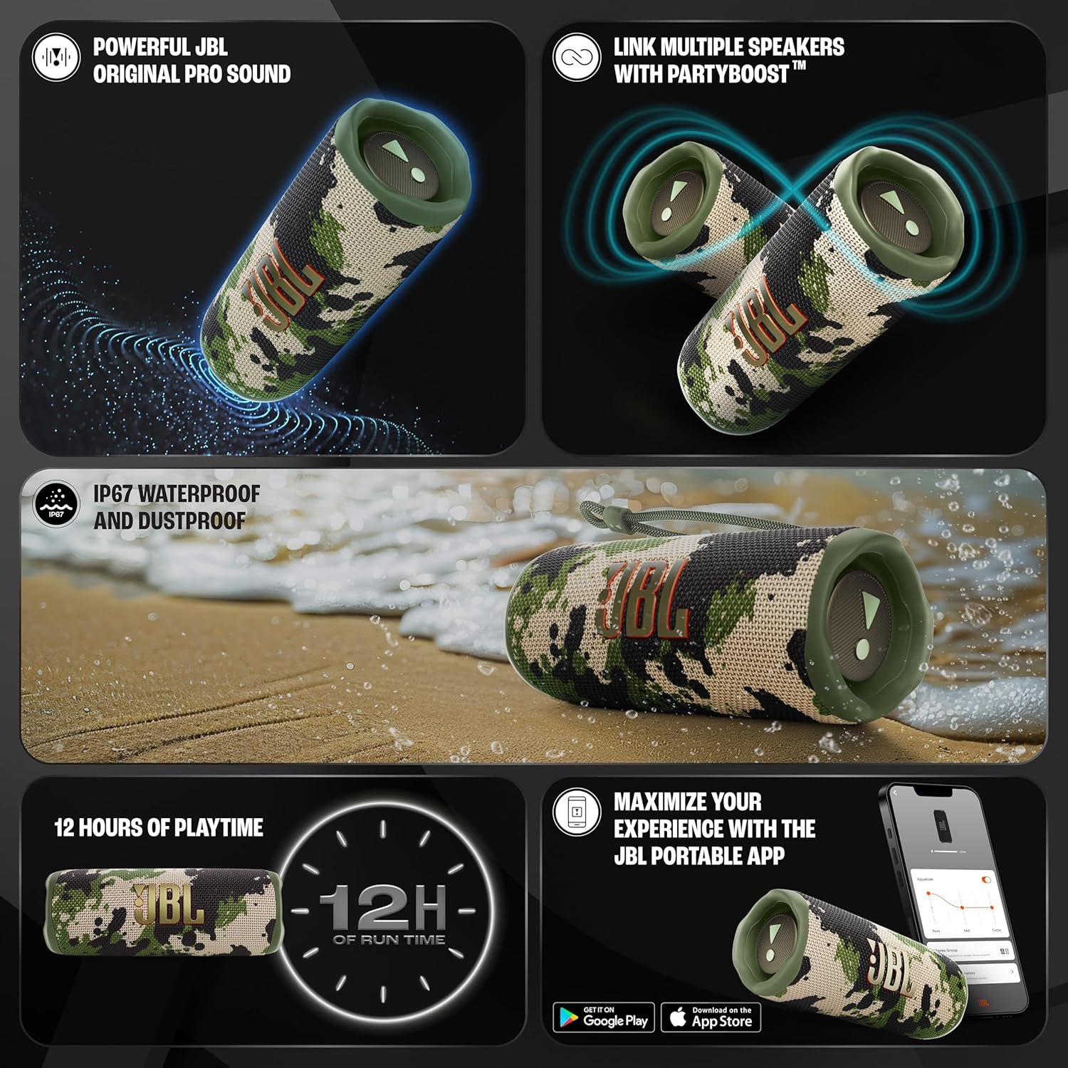 JBL Flip 6 Wireless Portable Bluetooth Speaker Pro Sound, Upto 12 Hours Playtime, IP67 Water & Dustproof, PartyBoost & Personalization App (Without Mic, Squad)