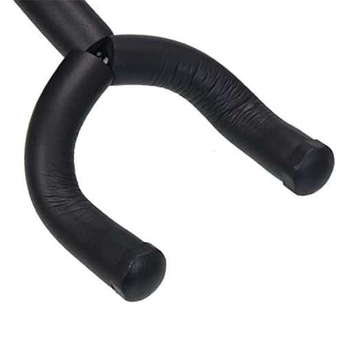 Made of steel to hold your instrument’s weight. It is padded with neoprene rubber to protect your instrument from scratches. It is also made in such a way that your guitar or bass does not touch the wall either.