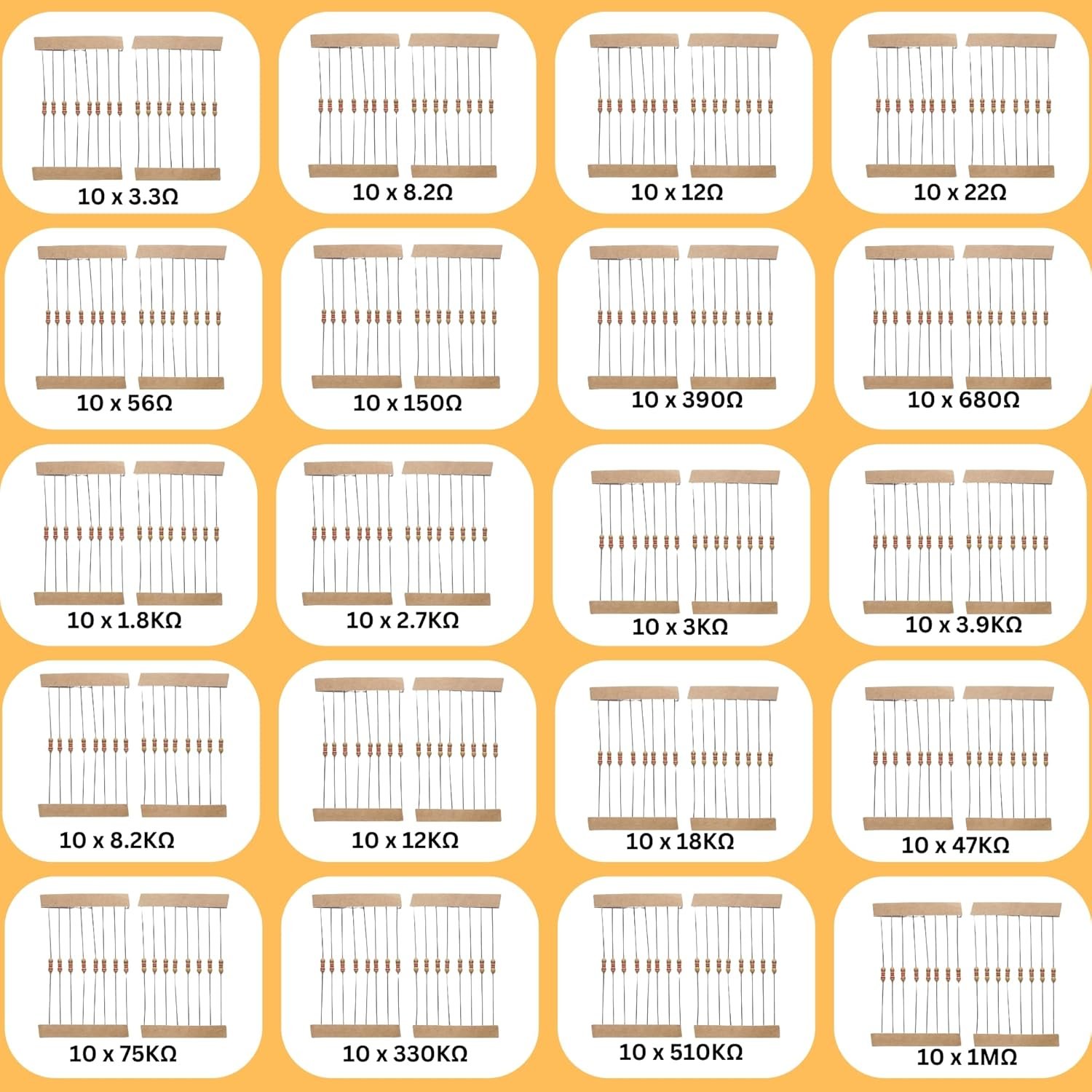 200-piece assortment of 1/4W carbon film resistors with values from 1 ohm to 1M ohm.