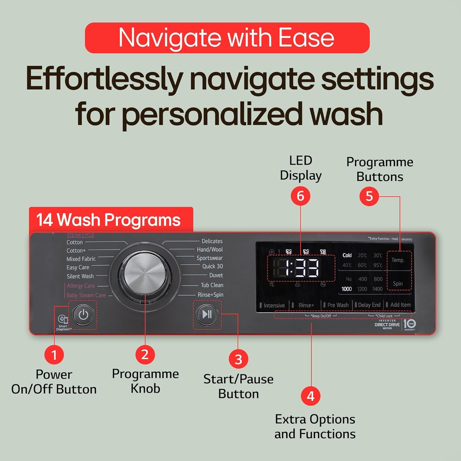 LG 9 Kg, 5 Star, AI Direct Drive Technology, Steam, 6 Motion DD & Wi-Fi Fully-Automatic Front Load Washing Machine (FHP1209Z5M, Intelligent & Convenient Fabric Care, Allergy Care, Middle Black)