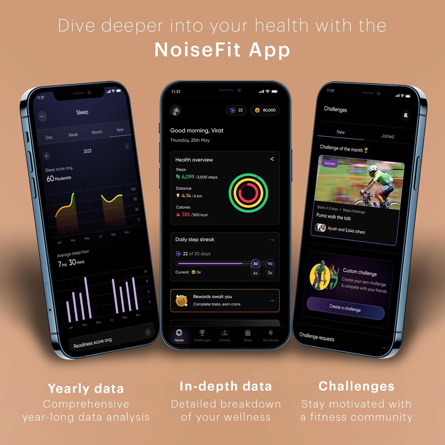 BT Calling: Stay connected on the go making every call effortlessly convenient.;NoiseFit app: Connect with the NoiseFit app where your health data and privacy are always protected. Unlock your peak potential by participating in challenges, track your progress, and keep pushing your limits with a community of fitness enthusiasts.