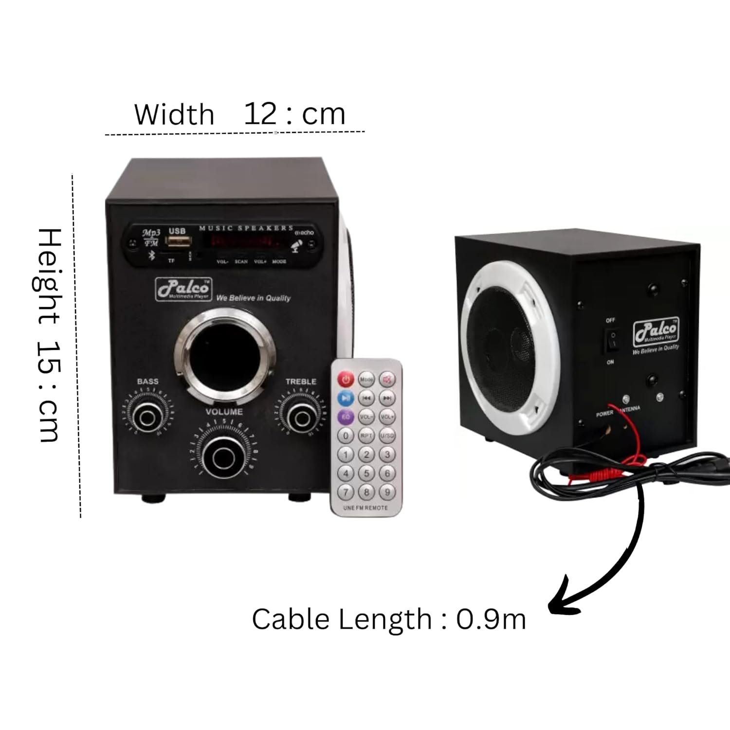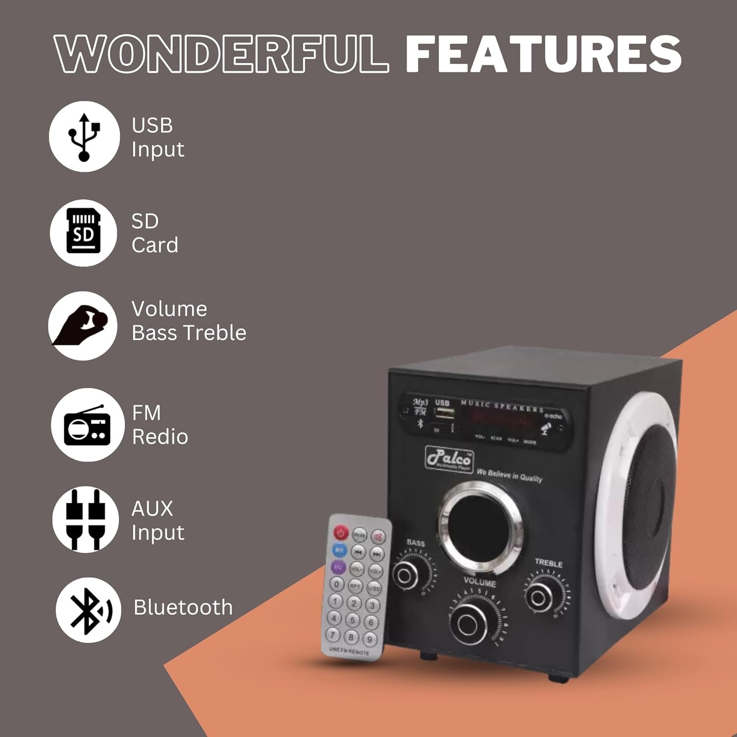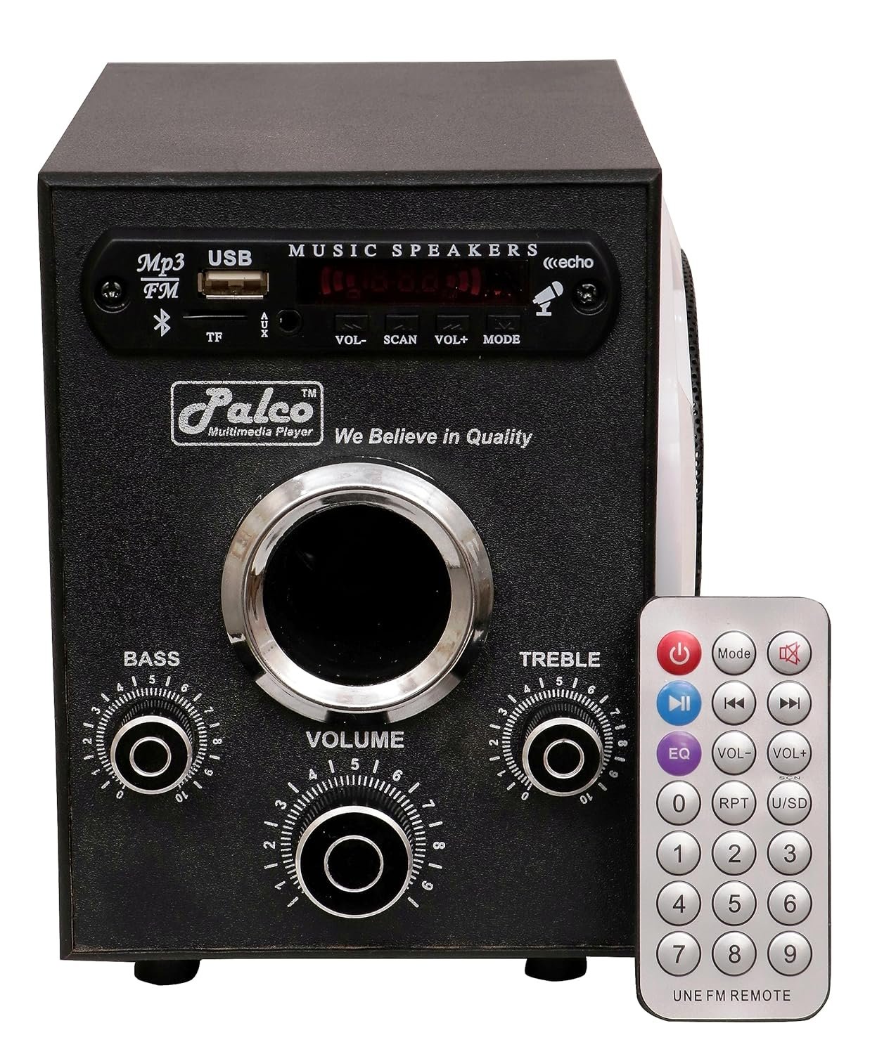 The speaker comes with a volume knob making it super efficient to take control of your volume .Enjoy deep, punchy sound wherever you like with PALCO EXTRA BASS speaker. Speaker Unit achieves sound quality and powerful sound pressure for a richer, deeper, more rewarding listening experience. these speakers provide sound quality and powerful sound pressure for a richer, deeper and more rewarding listening experience The music festival atmosphere created by the speaker. PALCO achieves high sound quality and powerful sound. Select your favorite playlists, cue the next song and sound mode. he product has USB,FM,AUX,SD support which can fulfilled everyone needs of music , this product produces loud and clear sound which makes it good music product. This product is specially designed for Home and personal purposes. The overall body design is quite good, there are three tones provided in the product for it superior functioning