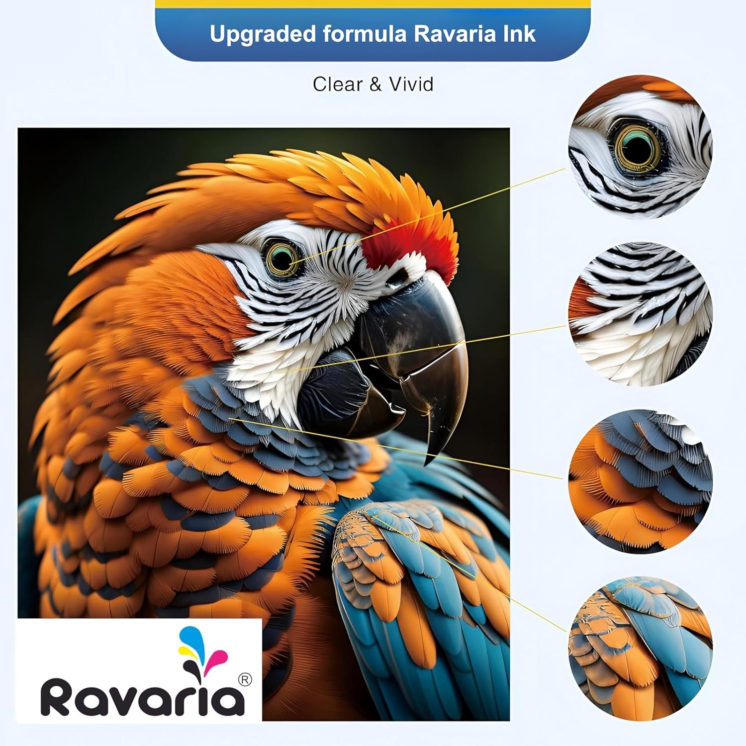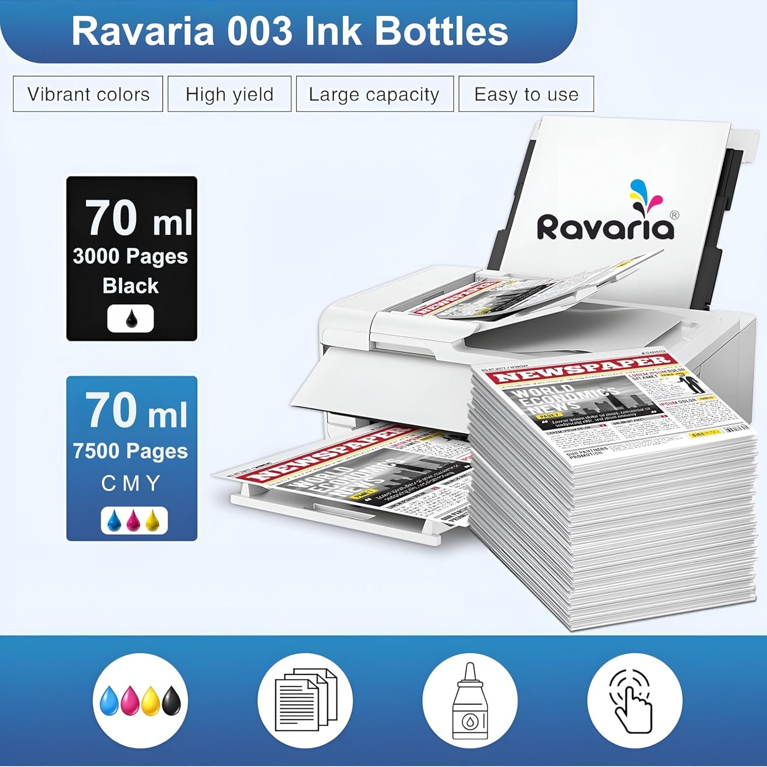 Introducing Ravaria Brand 003 Ink, offering high-yield refills for black (70ml, 3000 pages) and color (70ML, 7500 pages). Enjoy easy refilling for prolonged printing efficiency.