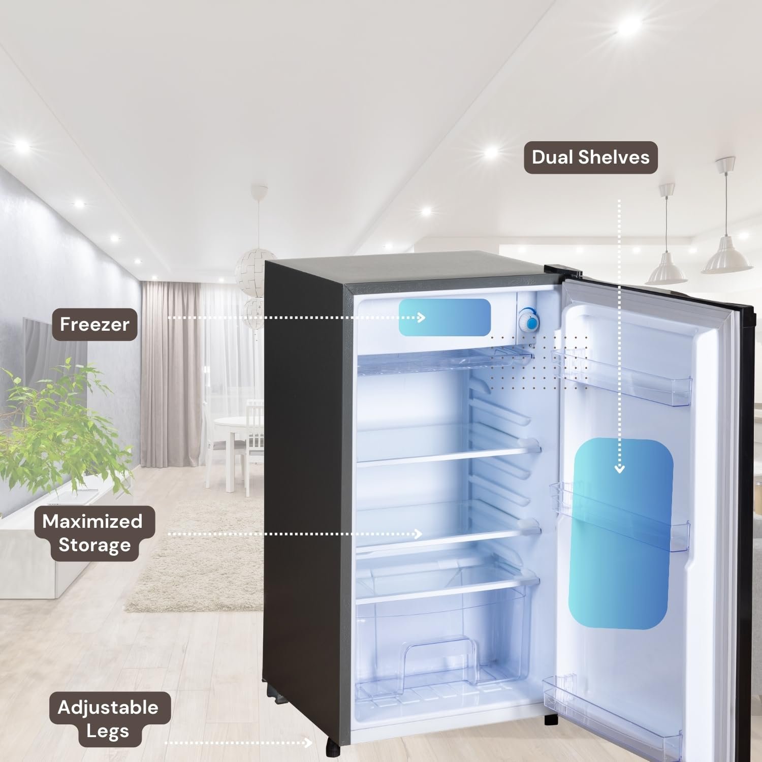 Capacity: With a storage capacity of 91 liters, this mini refrigerator provides enough space to store essentials like beverages, snacks, fruits, and a few frozen items. It’s perfect for individuals or small families looking for extra refrigeration without taking up too much space.