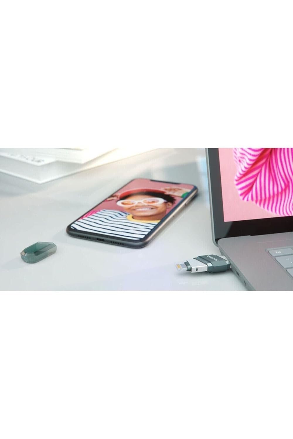 At a Glance The 2-in-1 flash drive with Lightning and USB Type-A connectors Easily free up space on your iPhone(1) Automatically back up photos and videos(2) Quickly move content from your drive to your computer Password-protect your files across devices(3) “Flip” cap protects Lightning connector, stows while in use