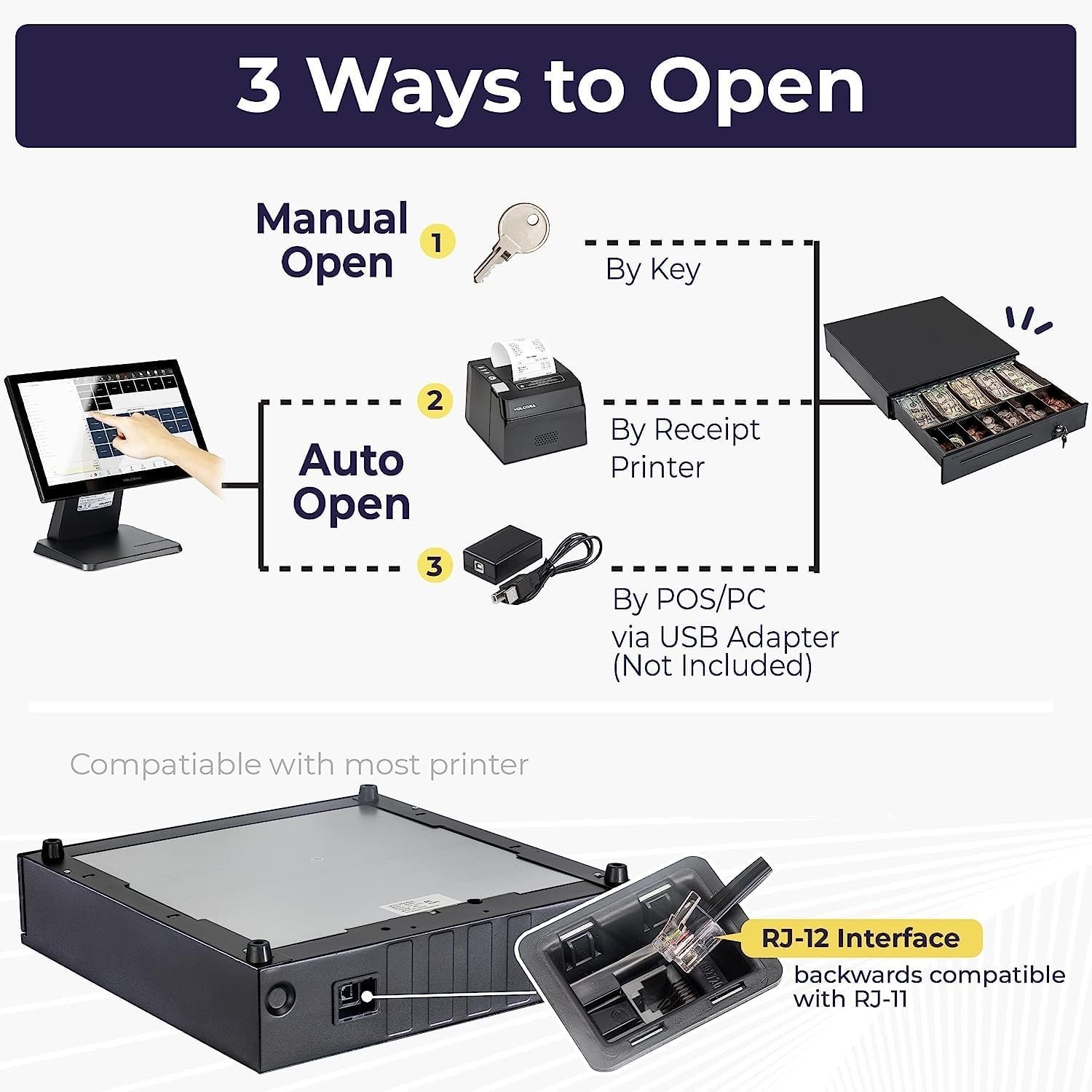 Compatible with thermal printers of all brands. Also suitable for manual use. Simple push the drawer in firmly when unlocked to open it manually.Professional Design, Steel Construction.