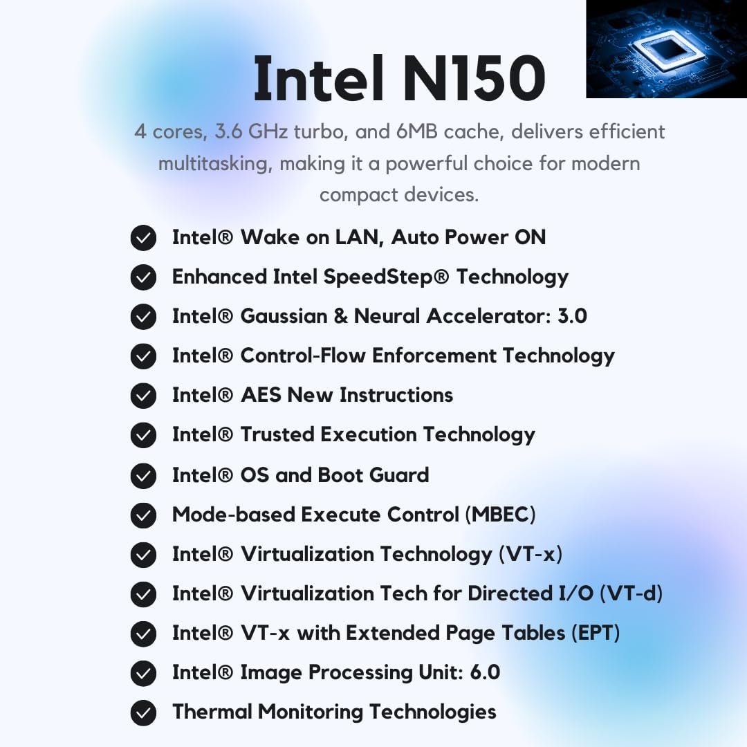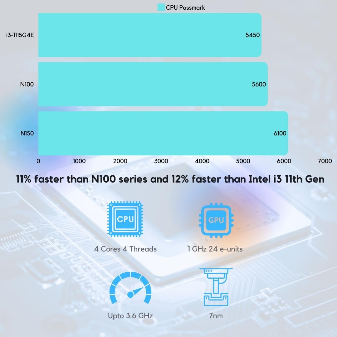 The Twin Lake N150 processor outperforms its competition, delivering 11% better speed than N100 and 12% faster performance than Intel i3 11th Gen. With 4 cores, 4 threads, up to 3.6GHz boost, and a 1GHz 24 e-unit GPU, this 7nm processor ensures efficient multitasking and enhanced computing power