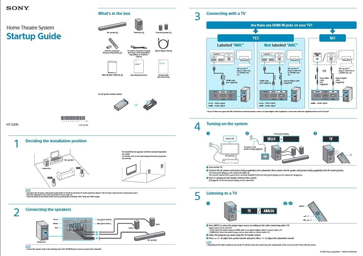 The HT-S20R is almost ready to go straight out of the box. Simply plug it in, wire up your rear speakers and external subwoofer, and enjoy 5.1 channels of real surround sound.