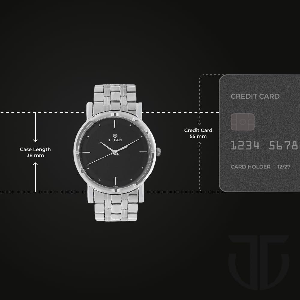 Understated elegance defines the Titan Karishma. A round black dial serves as a clean canvas for the graceful sweep of silver-toned hands. Minimalist baton markers indicate the hours with subtle refinement. The cool gleam of the silver-toned stainless steel link strap complements the dial, creating a cohesive and versatile look. This timepiece embodies a timeless charm, making it a sophisticated choice for any occasion and refined finishing touch to your ensemble.