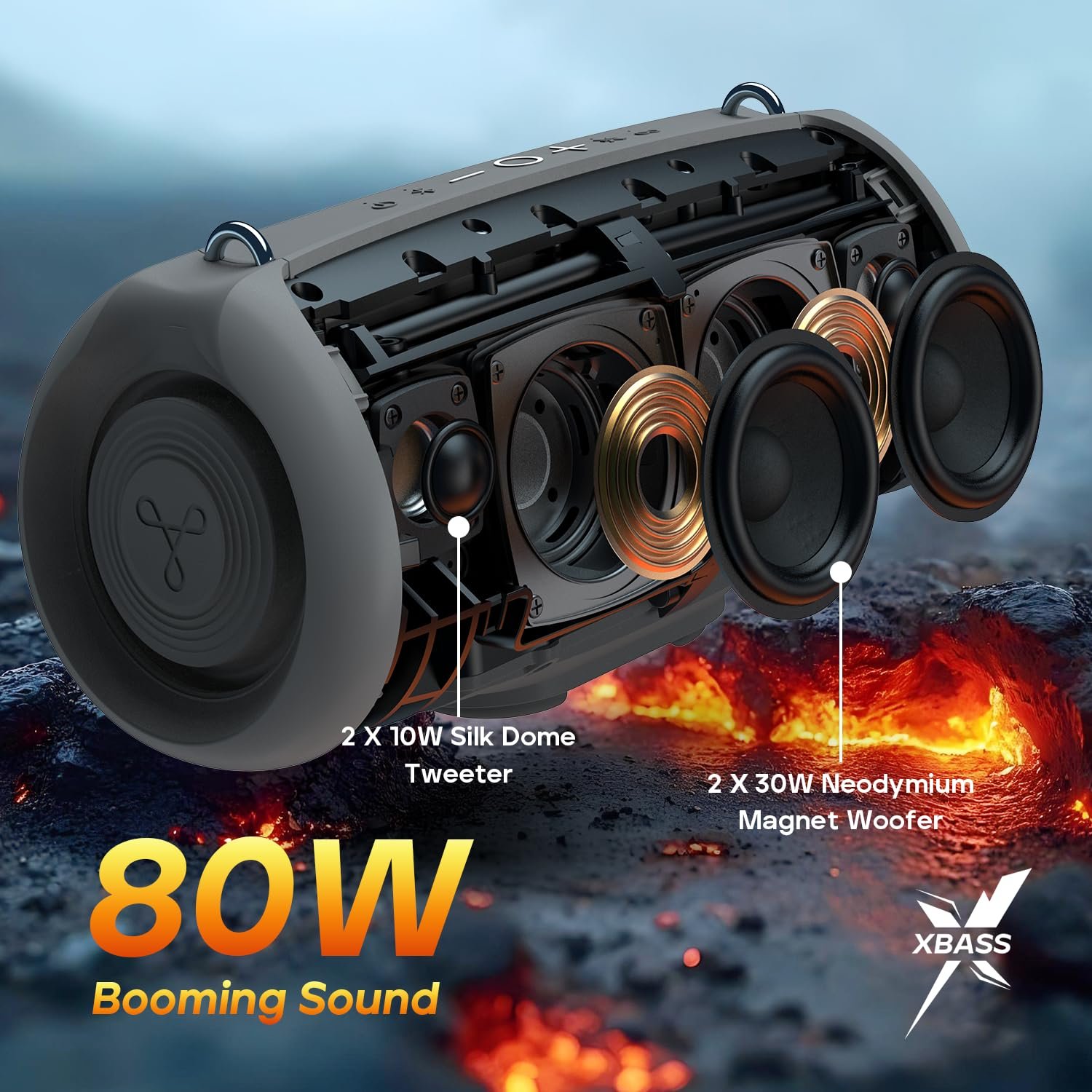 Tribit StormBox Lava Portable Bluetooth Speaker, 80W Loud Wireless Speaker, 24H Playtime, IP67 Waterproof, Bluetooth 5.4, Custom EQ, XBass, Built-in Mic, TWS Pairing for Camping/Beach/Party/Outdoor