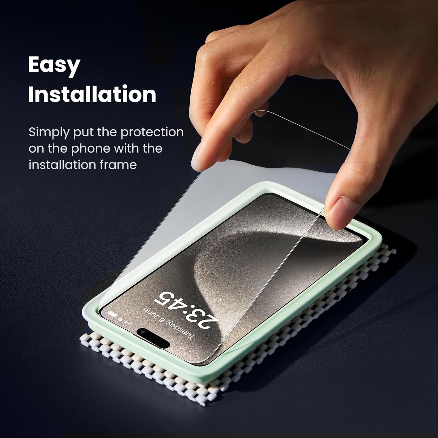 【Easy to Install】Package includes one self-installation kit, contains all the accessories needed to install the protector film. Only need to put the fitting alignment frame on the iPhone 15 Pro Max and place the tempered glass screen saver film over the frame.