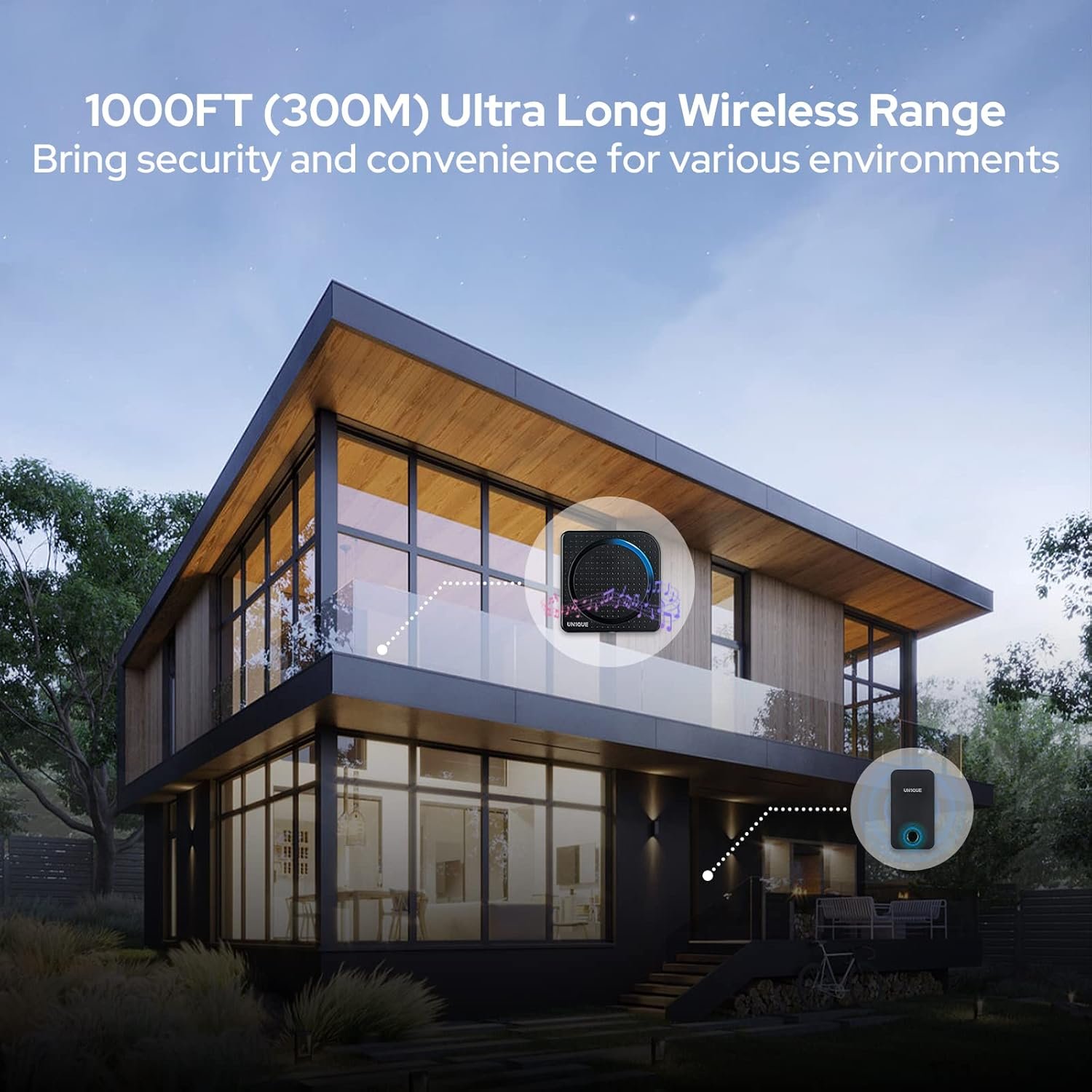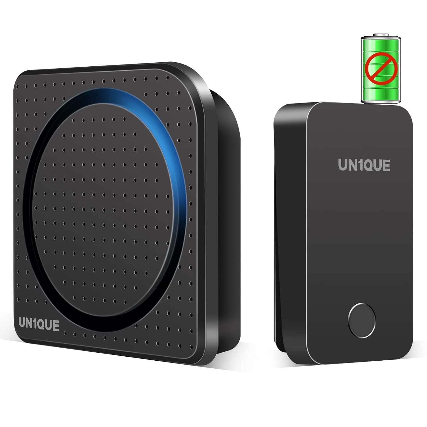 UN1QUE Wireless Door Bell for Home, Self-Powered Battery Free Cordless Calling Bell-1000ft Range with 38 Chimes,LED Light,4 Levels Volume (UB500 Black)