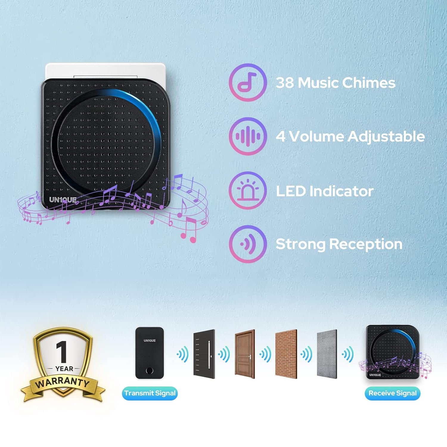 [ 38 Ringtones Available& 4 Volume Mode & Amazing LED ] Find your favorite Ringtones among 38 Chimes. 4 levels of volume for your space. Flashing LED-Light makes it easier for you to notice the coming visitors