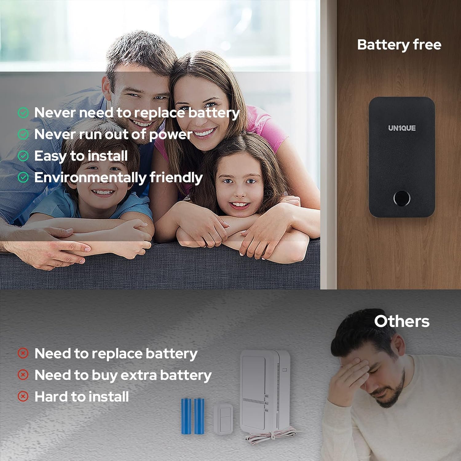 [Self-Powered Push Button Battery Free ] No battery required wireless doorbell. The push button generates electricity by itself. No more worrying about battery replacement