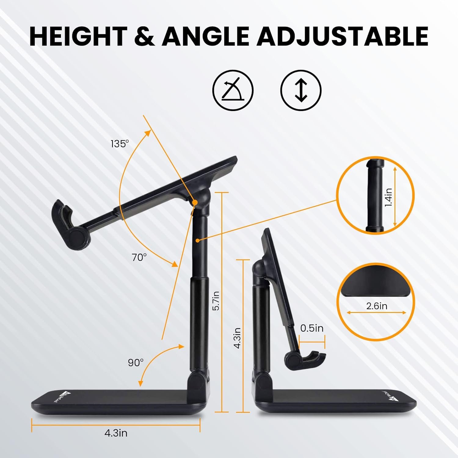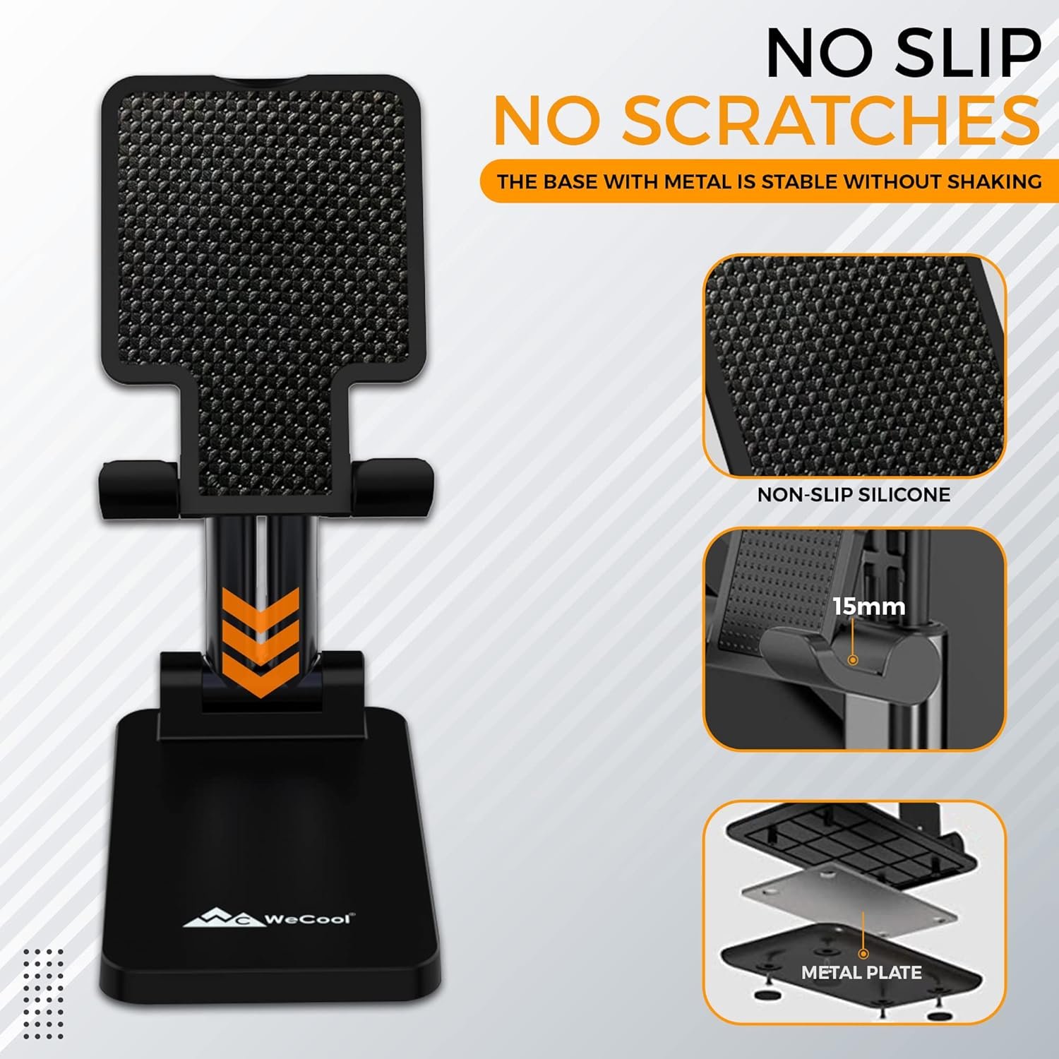 Anti-slip pad: The Phone holder for table has an anti-slip pad which works perfect to keep your devices in place while in use and prevent from daily scratches and sliding