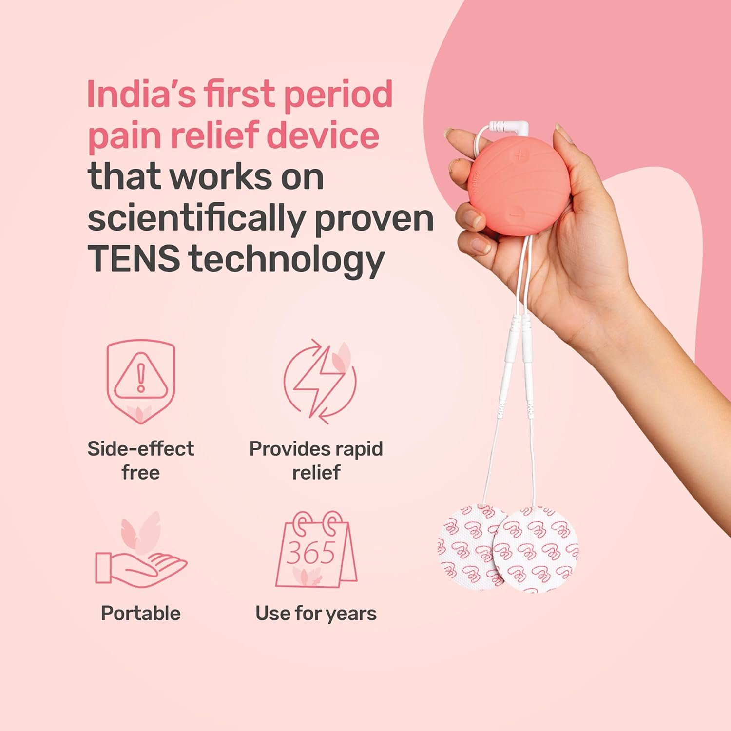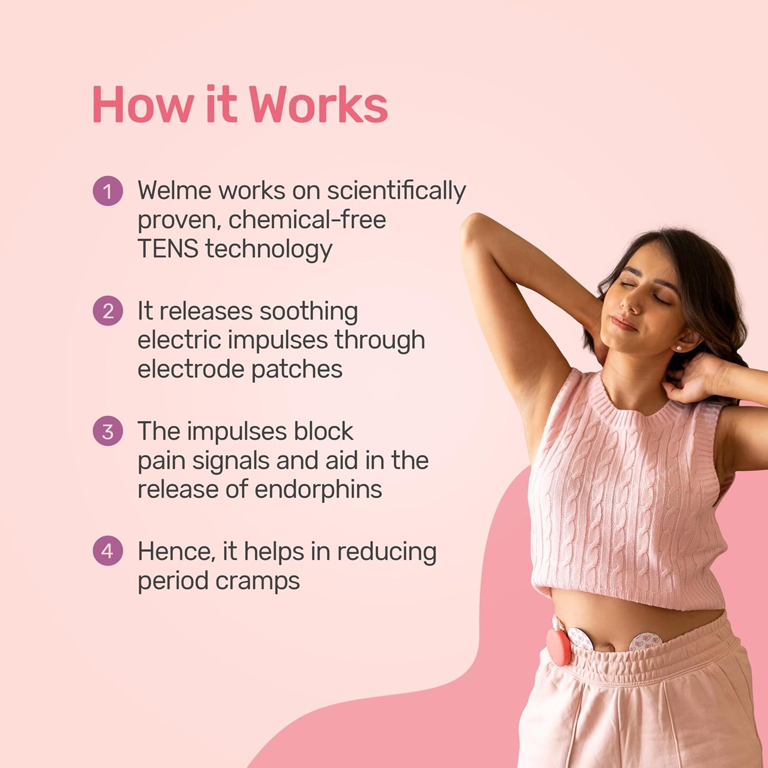 ADVANCED TENS TECHNOLOGY: Welme, the No. 1 period pain relief device, leverages advanced TENS PATENTED TECHNOLOGY to provide deeper, more effective menstrual cramp relief. This approach helps block pain signals and promotes holistic well-being for women as it helps to increase blood circulation.