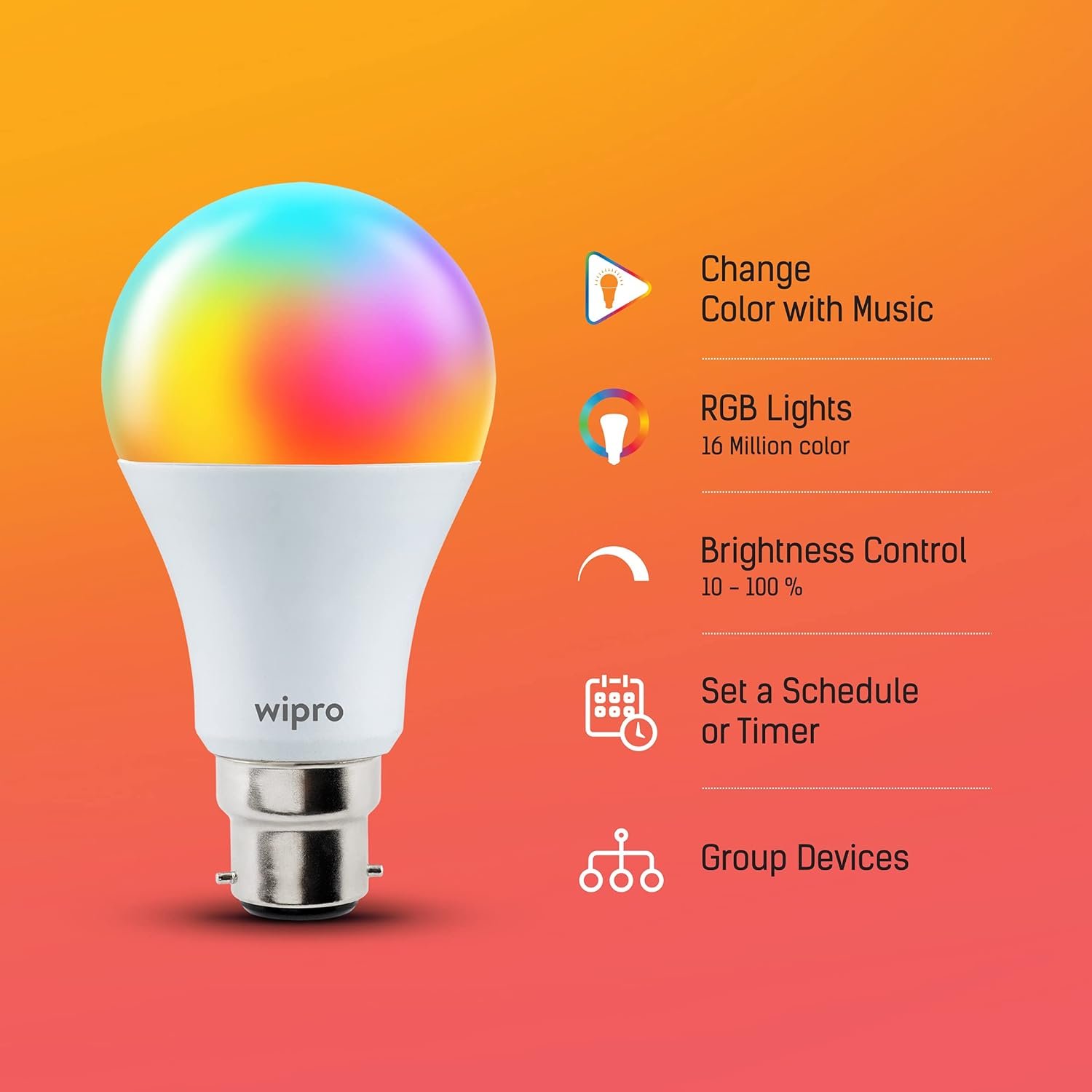 Wipro B22 12.5W Wi-Fi Smart LED Bulb with Music Sync for Amazon Alexa & Google Assistant (Pack of 1, Multicolor)