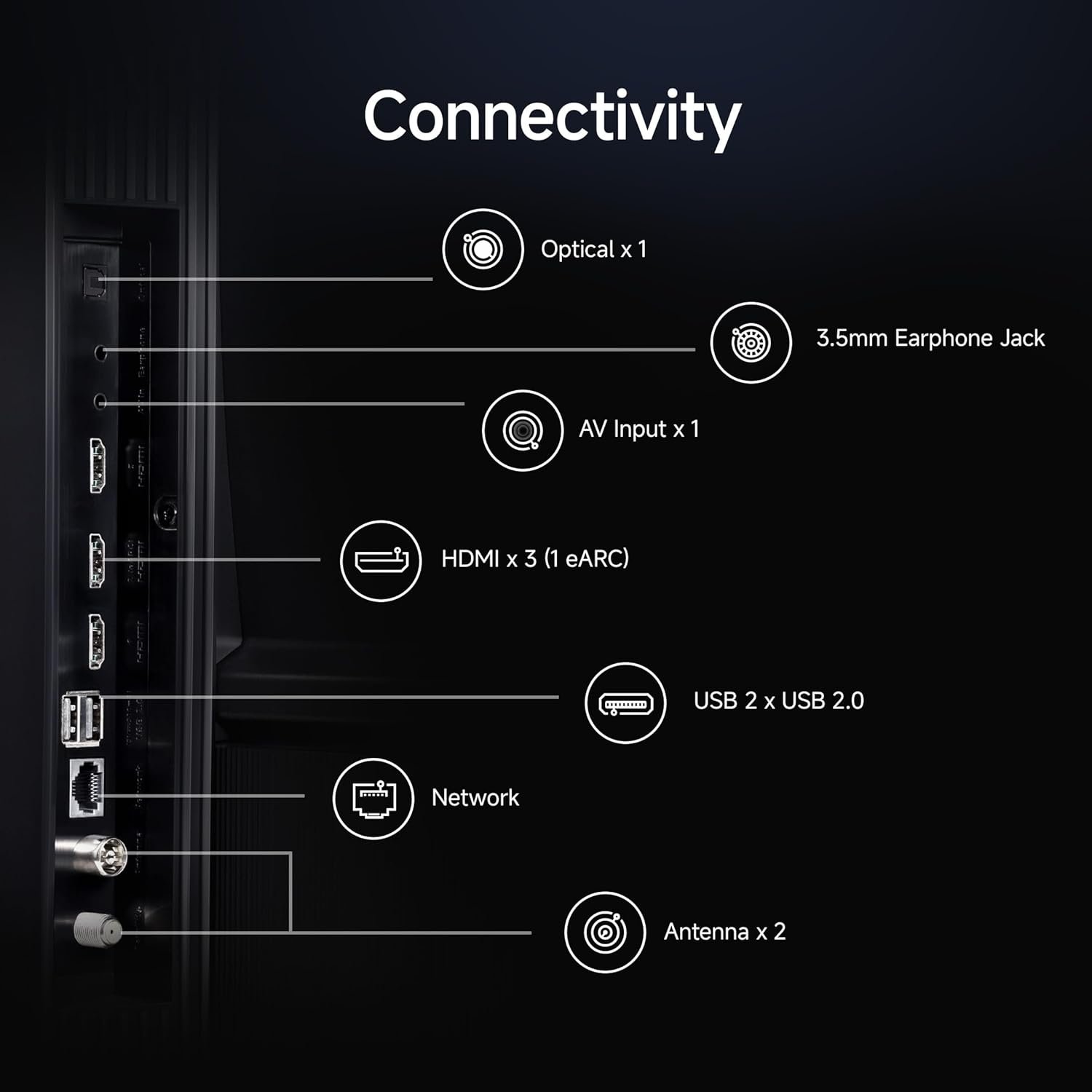 Connectivity: 3 HDMI ports to connect set top box, Blu-ray speakers or gaming console | 2 USB ports to connect hard drives or other USB devices | Bluetooth | Built-in Wi-Fi