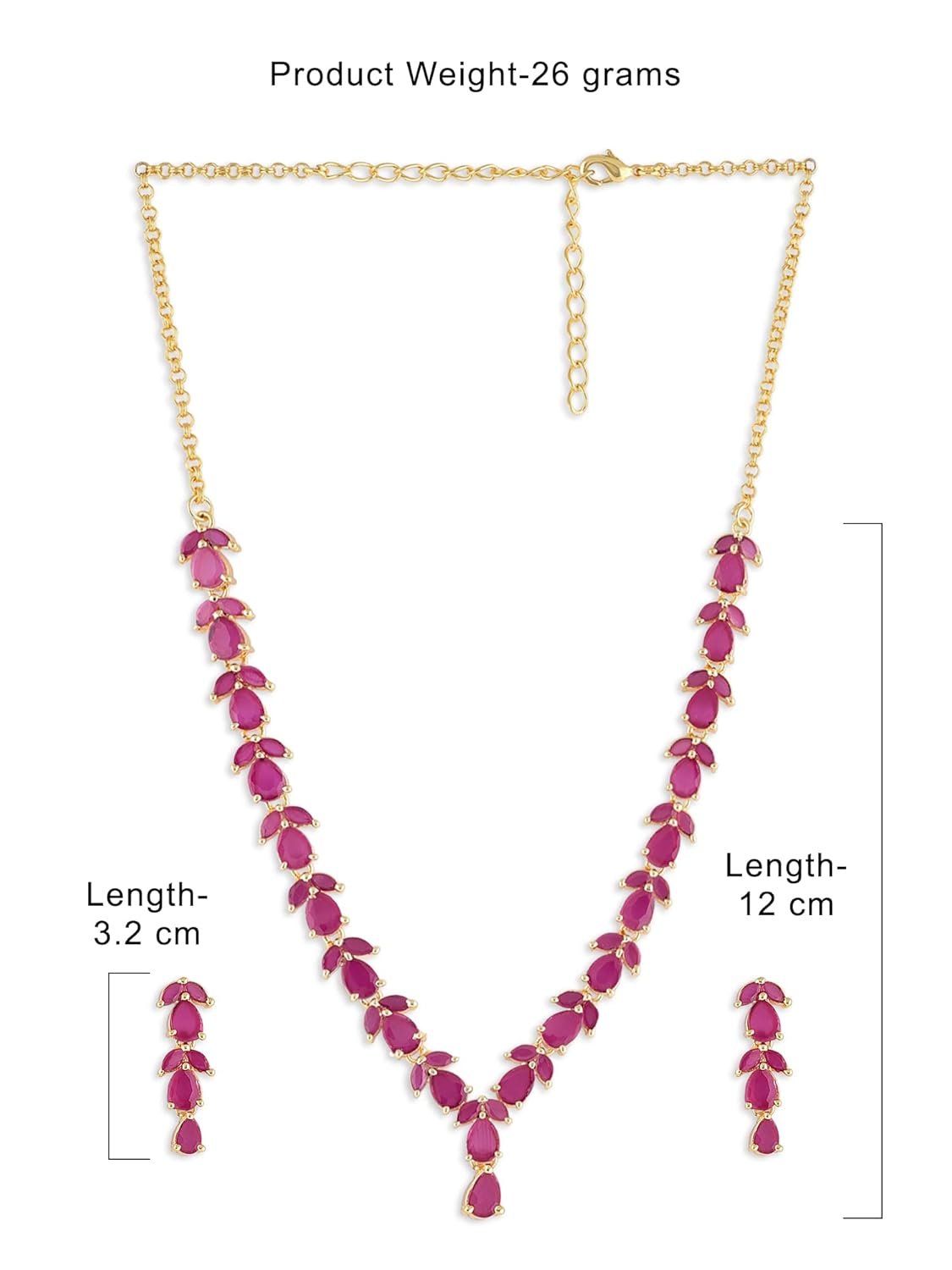 Customers find the jewelry set to be of good quality and value for money, with one noting it looks more expensive than it is. The color receives positive feedback, with one customer specifically mentioning the dark pink ruby stones, and customers like the finishing. However, the stone quality receives mixed reviews, with several customers reporting missing stones in the necklace. Moreover, the size is criticized for being small, and the chain hook is problematic, with multiple customers reporting that it doesn’t work properly.