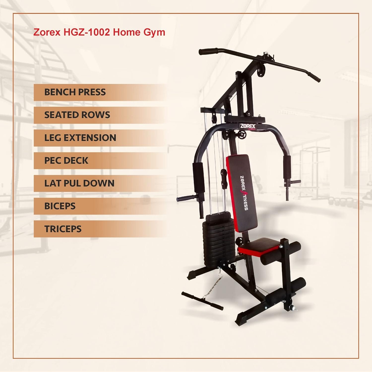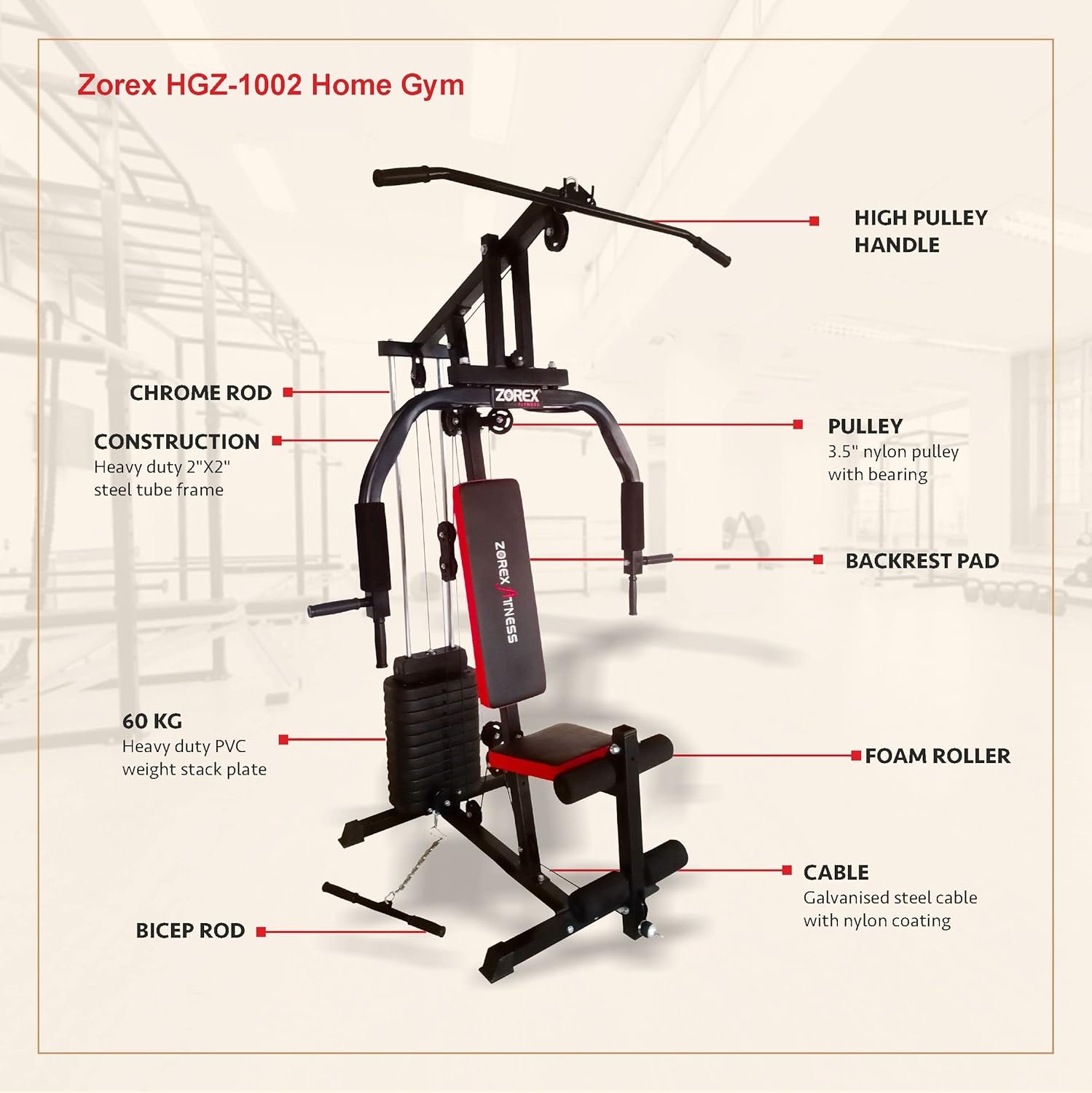 Zorex has always amazed the Indian audience with its spectacular fitness equipment that are synonymous with quality. Branching continuously to include a vast range of fitness gears and accessories,Zorex has done its best to make people initiate in fitness by developing quality products that caters to the specific needs of the masses.With its 2.2 inch square heavy duty construction, this gym system aids in building endurance and ultimate strength. As the system is simple to use, durable and requires less space for installation,it is suitable for both personal use. This gym equipment supports multiple exercise functions like chest extension, low pull, rowing, peck-deck, high pull and leg extension, which is necessary for rigorous continuous work-outs. With its no-cable-change design, this equipment offers more and more exercise options. Perfect for regular gym sessions, this system can be used by everyone irrespective of their age to tone the muscles in the body.